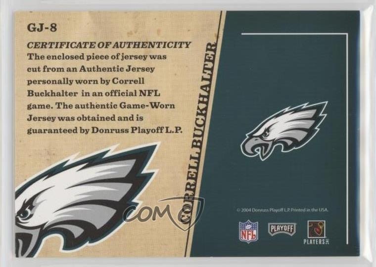 2004 Playoff Prestige - Game Day Jerseys #GJ-8 Correll Buckhalter - Football Card - Featuring the Philadelphia Eagles - Featuring Correll Buckhalter Search for more: 2004 Playoff Prestige Search for more: 2004 Playoff Prestige - Game Day Jerseys View all of our Listings Auctions Buy It Now About Us Located in the beautiful Pacific Northwest, COMC (Check Out My Cards) is the world's largest consignment service for trading card singles. More than 10,000 people have used our consignment service to list over 50 million trading cards. Find out how we can help you consign your items on eBay by contacting us through eBay messaging. COMC -- "The Safe & Easy Way to Buy & Sell" Representative Image - Select Specific Item above to see image of actual item Representative Image - Select Specific Item above to see image of actual item Raw Condition for Modern Cards Unless otherwise noted, raw modern cards are listed in Near Mint-Mint condition or better. A NM-MT card appears to be Mint at first glance, but upon closer inspection, may exhibit some of the following: minor print defects (e.g. roller marks, print line, dimple), minor scratches, slight edge wear, and slight corner wear. Centering is clearly visible in the images provided and does not factor into our condition assessment. Raw Condition for Vintage Cards Unless otherwise noted, raw vintage cards are listed in Excellent condition or better. An EX card may exhibit some of the following: minor rounding of corners, surface wear, print defects, light scratches, and slight edge wear/chipping. Centering is clearly visible in the images provided and does not factor into our condition assessment. Domestic Shipping Combined shipping for multiple items is available. To receive combined shipping, please ensure all desired items are in your eBay shopping cart before proceeding to checkout. eBay limits orders to 40 items per order. We automatically combine multiple orders placed on the same day. If you place multiple orders on the same day, please contact us to request a refund of applicable shipping costs. Signature confirmation may be required on invoices over $400. All cards are protected and shipped securely. International Shipping COMC offers eBay's International Shipping (EIS) for international orders under $2,500* (see country exceptions below). All duties and import fees are paid at checkout; in the rare event that there are additional import fees upon delivery, these are borne by the buyer. EIS packages route through a shipping hub in Erlanger, KY before shipping to their final destination. Please note that EIS does not allow for combined shipments. The shipping rates are determined by eBay and cannot be adjusted. *Maximum sale price exceptions: Colombia, Kuwait ($2,000); Taiwan ($1,539); Chile, Costa Rica, Guatemala, Honduras, Trinidad and Tobago ($1,000); Antigua and Barbuda, Aruba, Belize, Dominica, Grenada, Philippines, Saint Kitts and Nevis, Saint Lucia, Montserrat, Turks and Caicos Islands ($500); Dominican Republic, El Salvador ($200). Please request a shipping quote through eBay messaging for orders that exceed the maximum sale price supported by eBay's International Shipping. You will be responsible for all duties and import fees for international orders shipped outside the EIS. All cards are protected and shipped securely. Payment COMC does not accept offers on our cards through our eBay storefront. COMC utilizes eBay’s managed payments system. If you are experiencing difficulties making a payment, please contact eBay for assistance. Return Policy Returns are only accepted on the rare occasion the item is not as described. If you are making a return, please initiate the return process through eBay so a mailing label can be provided for you. Prior to listing, our expert team carefully assessed this item to represent it accurately. Please review the description and high-definition images prior to purchasing to ensure this item meets your satisfaction. We welcome you to contact us if you have further questions about this item. Trust and Integrity COMC carefully assesses each item consigned to us to prevent fraudulent items from entering the marketplace. If you believe an item offered on COMC may be fraudulent, please contact us with details so we can investigate the issue. Items we determine are outside our supported items policy may be removed. Last Modified: 6/10/2025 8:16:42 PM PDT