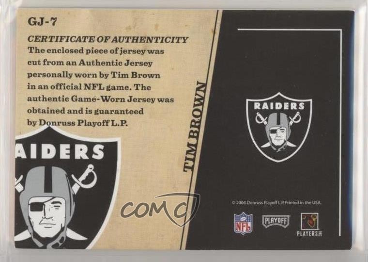 2004 Playoff Prestige - Game Day Jerseys #GJ-7 Tim Brown - Football Card - Featuring the Oakland Raiders - Featuring Tim Brown Search for more: 2004 Playoff Prestige Search for more: 2004 Playoff Prestige - Game Day Jerseys View all of our Listings Auctions Buy It Now About Us Located in the beautiful Pacific Northwest, COMC (Check Out My Cards) is the world's largest consignment service for trading card singles. More than 10,000 people have used our consignment service to list over 50 million trading cards. Find out how we can help you consign your items on eBay by contacting us through eBay messaging. COMC -- "The Safe & Easy Way to Buy & Sell" Representative Image - Select Specific Item above to see image of actual item Representative Image - Select Specific Item above to see image of actual item Raw Condition for Modern Cards Unless otherwise noted, raw modern cards are listed in Near Mint-Mint condition or better. A NM-MT card appears to be Mint at first glance, but upon closer inspection, may exhibit some of the following: minor print defects (e.g. roller marks, print line, dimple), minor scratches, slight edge wear, and slight corner wear. Centering is clearly visible in the images provided and does not factor into our condition assessment. Raw Condition for Vintage Cards Unless otherwise noted, raw vintage cards are listed in Excellent condition or better. An EX card may exhibit some of the following: minor rounding of corners, surface wear, print defects, light scratches, and slight edge wear/chipping. Centering is clearly visible in the images provided and does not factor into our condition assessment. Domestic Shipping Combined shipping for multiple items is available. To receive combined shipping, please ensure all desired items are in your eBay shopping cart before proceeding to checkout. eBay limits orders to 40 items per order. We automatically combine multiple orders placed on the same day. If you place multiple orders on the same day, please contact us to request a refund of applicable shipping costs. Signature confirmation may be required on invoices over $400. All cards are protected and shipped securely. International Shipping COMC offers eBay's International Shipping (EIS) for international orders under $2,500* (see country exceptions below). All duties and import fees are paid at checkout; in the rare event that there are additional import fees upon delivery, these are borne by the buyer. EIS packages route through a shipping hub in Erlanger, KY before shipping to their final destination. Please note that EIS does not allow for combined shipments. The shipping rates are determined by eBay and cannot be adjusted. *Maximum sale price exceptions: Colombia, Kuwait ($2,000); Taiwan ($1,539); Chile, Costa Rica, Guatemala, Honduras, Trinidad and Tobago ($1,000); Antigua and Barbuda, Aruba, Belize, Dominica, Grenada, Philippines, Saint Kitts and Nevis, Saint Lucia, Montserrat, Turks and Caicos Islands ($500); Dominican Republic, El Salvador ($200). Please request a shipping quote through eBay messaging for orders that exceed the maximum sale price supported by eBay's International Shipping. You will be responsible for all duties and import fees for international orders shipped outside the EIS. All cards are protected and shipped securely. Payment COMC does not accept offers on our cards through our eBay storefront. COMC utilizes eBay’s managed payments system. If you are experiencing difficulties making a payment, please contact eBay for assistance. Return Policy Returns are only accepted on the rare occasion the item is not as described. If you are making a return, please initiate the return process through eBay so a mailing label can be provided for you. Prior to listing, our expert team carefully assessed this item to represent it accurately. Please review the description and high-definition images prior to purchasing to ensure this item meets your satisfaction. We welcome you to contact us if you have further questions about this item. Trust and Integrity COMC carefully assesses each item consigned to us to prevent fraudulent items from entering the marketplace. If you believe an item offered on COMC may be fraudulent, please contact us with details so we can investigate the issue. Items we determine are outside our supported items policy may be removed. Last Modified: 6/10/2025 8:16:40 PM PDT