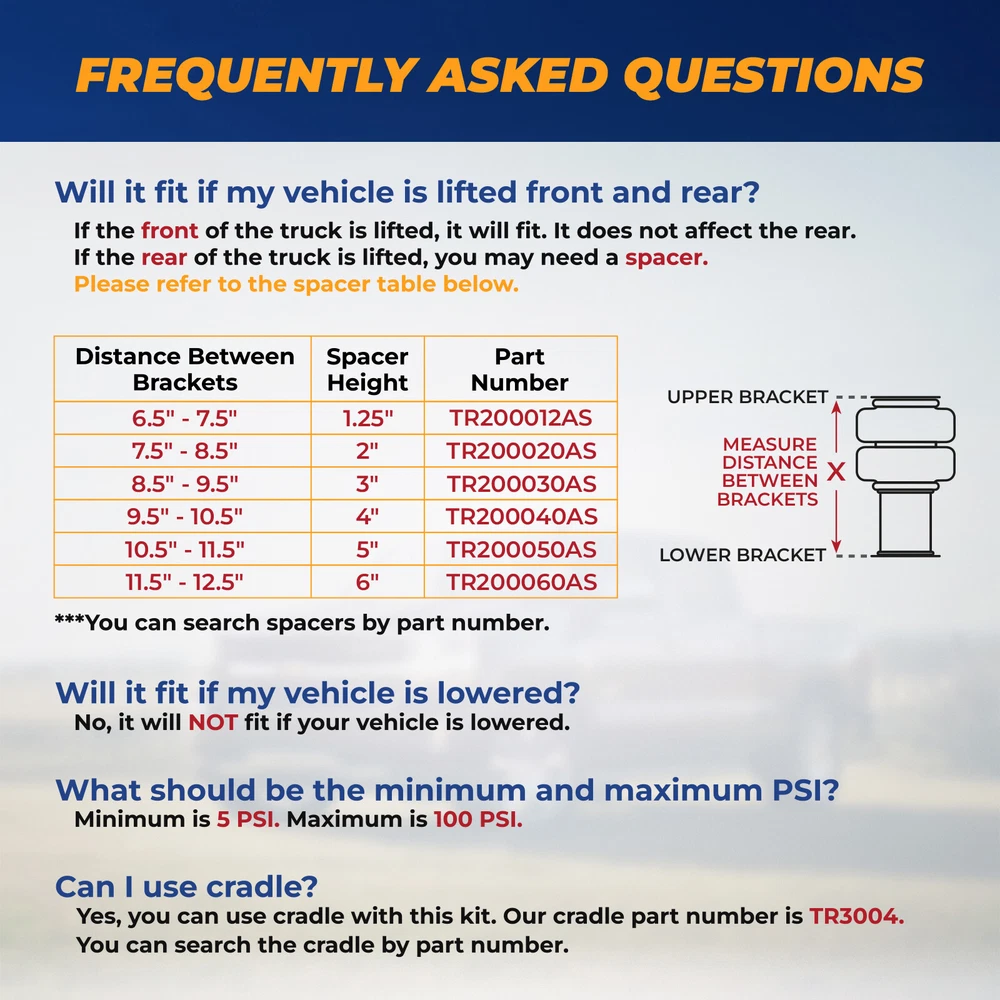 Aftermarketus Ebay - High-Quality Torque HD Air Spring Helper Suspension Kit - Kit includes 2 air springs, all brackets, installation manual, bolts and nuts. - Fits following vehicles: - 2004-2008 Ford F150 (2WD & 4WD) (Not FX2) - (FOR REAR ONLY) - Easy to install. No need to drill. - Increase stability and improve ride quality - Keep your vehicle level when you are hauling a heavy load - Improve steering control and braking when you are hauling or towing - Reduce tire wear - Reduce strain on rear suspension - Air helper springs will not increase your vehicle's weight-carrying capacity. Do not exceed the manufacturer's recommended weight limit. Replaces Firestone Ride-Rite: 2350 Specifications Load-leveling capacity : 5000 lbs Adjustable air pressure : 5 psi to 100 psi In-Bed Hitch Compatible : No Returns Payment Shipping Refund About Us & Feedback - Buyer will be charged 10% restocking fee after 30 day of the purchase for any unused returned item. - All Items must be returned with all original contents and components with prior authorization. - Return shipping shall be the responsibility of the buyer. We pay the shipping to send replacement. - In case of damaged parcel: * Carrier might damage items during shipping. * Please inspect the package well before accepting the shipment from the carrier. * To report a damage parcel, please contact us. * We will follow up and file a "damage claim" with the carrier. * All shipping, packaging materials and boxes must be saved. * Carriers will pickup the damaged item for inspection. - We accept PayPal and only ship to a confirmed address. - We accept E-Check through PayPal, Will ship after checks clears. (usually takes 7-10 days. - Items will ship out once the payment is made. - Checkout is expected within 3 days of auction close and payment within 4 days. - Unpaid auction wins will be forfeited after 4 days. - All orders are processed within 2 business day of receipt of payment. - The tracking number will be sent to you via e-mail when items are shipped. - Local pick up is available. Please email for arrangements. - Only ship to the confirmed address provided by PayPal. Please make sure your address in PayPal matches the address you would like us to ship to. - Address changing must be confirmed by our customer service before payment. - We DO NOT ship to Hawaii, Alaska, APO, FPO, and Puerto Rico. - Shipping fees and return fees are not refundable. Aftermarket US offers a Warranty for US customers on Torque Parts Truck & Trailer Air Springs, Air Brake Components, Wheel Seals. We warranty our rolling lobe (reversible sleeve) and convoluted air springs for semi-trucks and trailers for a limited lifetime. Every other product that we offer including convoluted air springs for pickup trucks, our cabin (sleeper) air springs, air brake components, and wheel seals are warrantied for one (1) year unlimited miles. Torque Parts is confident that you will be 100% satisfied with your product that we offer a 30-Day Return Policy on unused and uninstalled products. Improper use or installation is not a manufacturers defect. Please see the Torque Parts warranty page for more details about Limited Lifetime Warranty details. Aftermarket US air suspension products are warranted to be free from defects in materials or workmanship for the warranty period from the date of purchase. Within this period, Aftermarket US will, at its sole option, repair or replace any components that fail in normal use. Such repairs or replacements will be made at no charge to the customer for parts, provided that the customer shall be responsible for any transportation and installation costs. This warranty does not apply to: (I) cosmetic damage, such as scratches, nicks and dents; (II) normal wear and tear, unless product damage has occurred due to a defect in materials or workmanship; (III) damage caused by accident, abuse, misuse, water, flood, fire, or other acts of nature or external causes; (IV) damage caused by improper installation; (V) damage to a product that has been modified or altered without the written permission of Aftermarket US Inc.; or (VI) damage to a product that has been installed on a vehicle suspension that been modified or altered. If the unit sent in is still under its original warranty, then the new warranty is 90 days or to the end of the original warranty, depending upon which is longer. THE WARRANTIES AND REMEDIES CONTAINED HEREIN ARE EXCLUSIVE AND IN LIEU OF ALL OTHER WARRANTIES EXPRESSED, IMPLIED, OR STATUTORY, INCLUDING ANY LIABILITY ARISING UNDER ANY WARRANTY OF MERCHANTABILITY OR FITNESS FOR A PARTICULAR PURPOSE, STATUTORY OR OTHERWISE. THIS WARRANTY GIVES YOU SPECIFIC LEGAL RIGHTS, WHICH MAY VARY BY JURISDICTION. IN NO EVENT SHALL Aftermarket US, INC. BE LIABLE FOR ANY INCIDENTAL, SPECIAL, INDIRECT, OR CONSEQUENTIAL DAMAGES, WHETHER RESULTING FROM THE USE, MISUSE, OR INABILITY TO USE THIS PRODUCT OR FROM DEFECTS IN THE PRODUCT. SOME JURISDICTIONS DO NOT ALLOW THE EXCLUSION OF INCIDENTAL OR CONSEQUENTIAL DAMAGES, SO THE ABOVE LIMITATIONS MAY NOT APPLY TO YOU. Aftermarket US retains the exclusive right to repair or replace (with a new or newly remanufactured replacement product) the product or offer a full refund of the purchase price at its sole discretion. SUCH REMEDY SHALL BE YOUR SOLE AND EXCLUSIVE REMEDY FOR ANY BREACH OF WARRANTY. To obtain warranty replacement, contact the vendor from which you purchased your Aftermarket US product. If purchased directly from Aftermarket US Inc. please contact Aftermarket US Technical Support for shipping instructions and an RMA tracking number. Securely pack the product and a copy of the original sales receipt, which is required as the proof of purchase for warranty repairs. Write the RMA tracking number clearly on the outside of the package. Send the product, freight charges prepaid, to Aftermarket US Inc. Products purchased through online part stores and auctions (this does not apply to purchases made directly from A