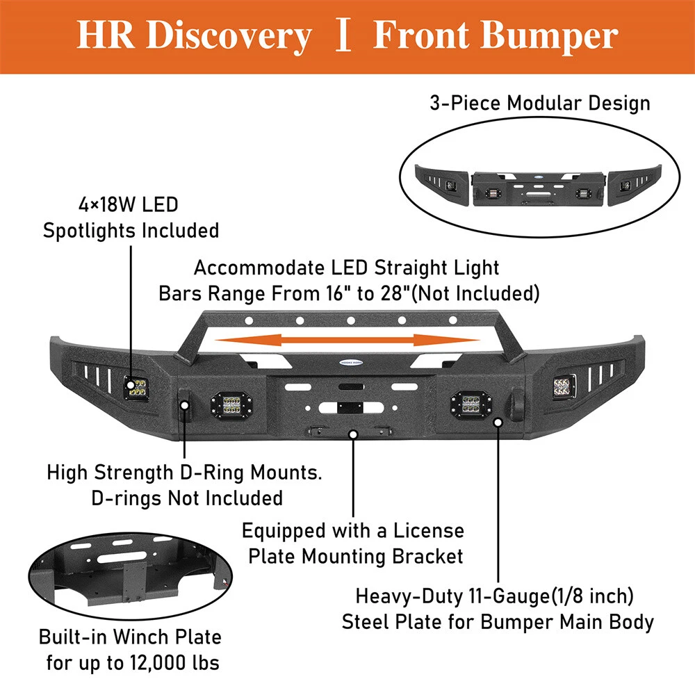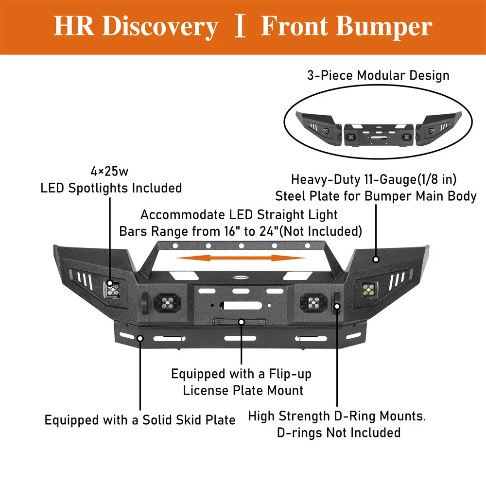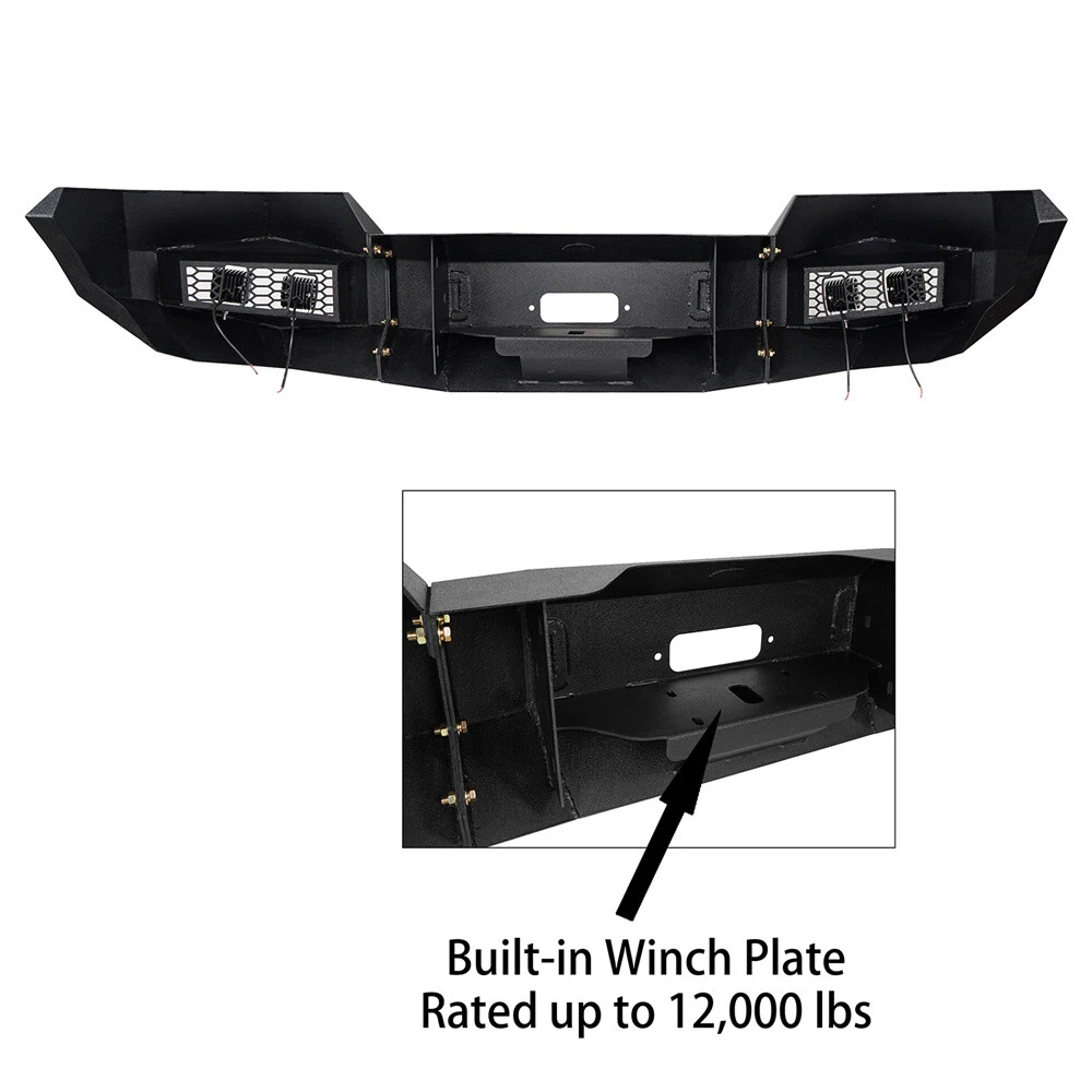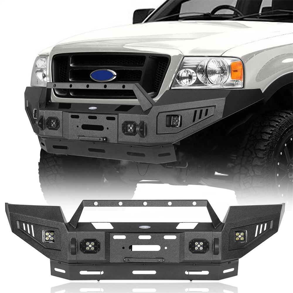 Jeep Gladiator JT Jeep Wrangler JL Jeep Wrangler JK Jeep Wrangler TJ Jeep Wrangler YJ Jeep Cherokee Jeep Wrangler CJ7 CATALOG Other Jeep series Jeep Gladiator 2020-2024 JT Jeep Wrangler 2018-2024 JL Jeep Wrangler 2007-2018 JK Jeep Wrangler 1997-2006 TJ Jeep Wrangler 1987-1995 YJ Jeep Cherokee 1984-2001 Jeep Wrangler 1976-1986 CJ 7 Toyota series Tacoma 2005-2023 Tundra 2007-2021 Ford Series Ford F-150 Ford F-250 F-350 Ford Bronco Ford Ranger Ram series Ram 1500 Ram 2500 3500 Chevy Silverado series Silverado 1500 2007-2013 Silverado 1500 2014-2015 Silverado 1500 2016-2018 GMC Sierra Motor Light& Brackets Tail & Turn Lights Fog Lights & Mounts Universal Fitment Product FULL WIDTH STEEL FRONT BUMPER W/WINCH PLATE & LED LIGHT FOR 2004-2008 FORD F150 Type 1 Front Bumper 3-piece design full-width front bumper Rugged off-road look with Hooke Road Logo Fully-welded D-Ring mounts with 4.75-ton capacity. 9500 lbs rated, 3/4'' D-rings included Built-in winch plate rated up to 12000 lbs 4×18w LED spotlights included Not Compatible with Factory Sensors Easy bolt-on installation. No drilling required. Heavy-duty 11-gauge(1/8 Inch) steel for the bumper main body, 8-gauge(11/64 Inch) for the structural connection plates and winch plate Textured black powder coat finish & Premium E-coating process inside Bumper weight: about 145 lbs Type2 Front Bumper 3-piece modular design Rugged styling and excellent protection Features high strength D-ring mounts welded both inside and out with a 4.75-ton capacity. D-rings not included. Comes with 4×18w white LED spotlights Accommodates straight LED light bars ranging from 16" to 28"(Not Included) Equipped with a flip-up license plate mounting bracket Built-in winch plate for up to 12,000 lbs winch Heavy-duty steel construction: 11-gauge(1/8 Inch) steel for the bumper main body, 10-gauge(9/64 Inch) steel for the winch plate and mounting structure plate. Textured black powder coat finish & Premium E-coating process inside Bumper weight: about 82 lbs Easy bolt-on installation without drilling or cutting Type 3 Front Bumper 3-piece modular design Practical functionality design, reinforced front-end protection Includes 4×25w LED spotlights Accommodate straight LED Light bars range from 16" to 24"(Not Included) Features high strength D-ring mounts. D-rings not included Equipped with a flip-up license plate mount Built-in winch plate for up to 12, 000 lbs Equipped with a solid skid plate Heavy-duty, high tensile 11-gauge(1/8 in) steel for bumper main body, 8-gauge(11/64 in) steel plate for mounting structure and winch plate Textured black powder coat finish & Premium E-coating process inside Bumper weight: about 90 lbs Direct bolt-on installation. No drilling required Package Included (one bumper) Front Bumper Assembly Mounting Hardware Kit Installation Instruction Fitment: Fits for 2004-2008 Ford F-150 Models DELIVERY DETAILS PAYMENT ABOUT RETURN ABOUT US CONTACT US DELIVERY DETAILS Normally, your package will be handed to USPS/FedEx by 2 workdays, and the following delivery could take 1-10 day(s). Our warehouses are in CA/NJ, US. Your package will be shipped from the nearest warehouse which has stock. During the epidemic situation, information of logistics updated as well as deliveries could be delayed caused by lack of man power from logistics company. If the logistics information shows "Shipment information sent to XXX", your package has been handed to the logistics personnel. Please be patient or contact us for further information. PAYMENT We accept Paypal, Visa, Mastercard, Apple Pay, Google Pay, American Express etc. ABOUT RETURN We provide 30 days return guarantee for all items that we sold. But please contact us first. We will be happy to exchange or refund. All returned products must be in original condition and packaging. Please take some pictures of the product to us before sending out. Unfortunately, if products have been assembled or modified, we cannot take them as returns. Please save your return tracking number or post receipt, and email it to us. We need this in case there are any issues during transit. Refund will only be issued upon our receipt of the returned parcel. If the product was damaged on the return shipping way, we can only offer partial refund. ABOUT US We are the authorized dealer of the "Hooke Road®" brand. The Hooke Road Brand has been certified as a member of SEMA. We have our own factory and design team. We make all kinds of specialty parts and accessories to make vehicles more attractive, more unique, more convenient, faster, safer, more fun and even like-new again. Wish you have a terrific off-road experience with our products. CONTACT US Please contact us via eBay message. All E-mail will be replied within 24 Hours in working days or 48 hours on weekend. If you are satisfied with your purchase, please leave us 5 Star Ratings and Positive Feedback. It will be highly appreciated! Warm Prompt: If you have any problems with this order/item, such as items not being received on time or packages being damaged, please contact us firstly. We will give you a satisfactory solution. SHOP BY BRANDS Brand Hooke Road Manufacturer Part Number Y8001020304 Type Bumper Placement on Vehicle Front Color Black Material Steel Finish Powder-Coated, Textured Manufacturer Warranty 2 Year Features Durable, No Drilling Required, Scratch-Resistant, Easy Installation Fit For 2004-2008 Ford F150 OE/OEM Part Number Y8001020304 Attachment Type Bolt-On Items Included Mounting Hardware, Bolts, Screws, LED Light Vintage Part No Performance Part Yes Bumper Cut-Outs Tow Hook Cut-out, Towing Hitch Cut-out