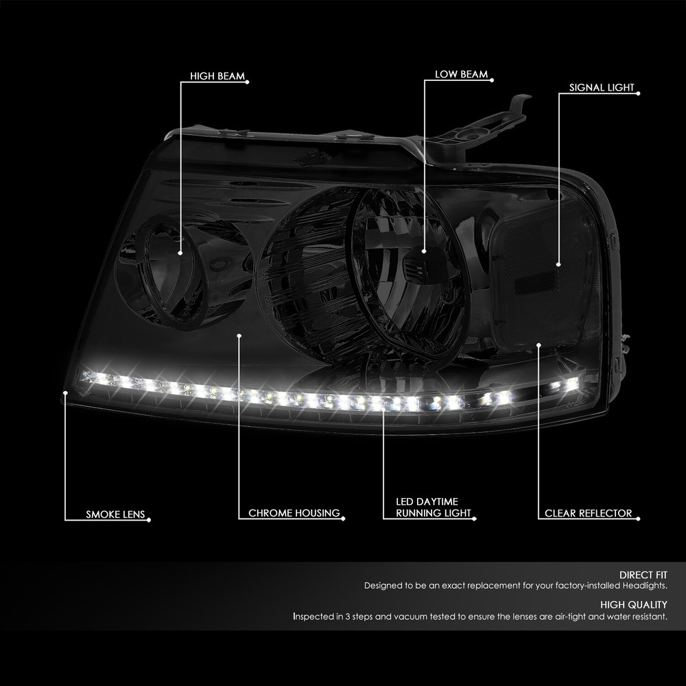 Welcome to our eBay store DPT Motorsport Business Hours: Monday - Friday, 9 AM to 6 PM PST. Store Home Payment Shipping Returns Need Help Add to Favorites About Us Fit 04-08 Ford F150 Lincoln Mark LT Chrome Housing Smoked Lens LED DRL Headlight Product Description A headlight (headlamp) is a lamp attached to the front of a vehicle to light the road ahead. Headlight performance has steadily improved throughout the automobile age, spurred by the great disparity between daytime and nighttime traffic fatalities. Headlights are one of the most important components of your vehicle; they allow you to see the road in front of you clearly during the night and in any bad weather that may arise. Our headlights upgrade the face of your vehicle with clear style and extreme range. Make of High-Grade Durable ABS Plastic Materials Smoked Lens with Chrome Housing Sold as a Pair (Driver & Passenger Side) Direct Bolt-on Replacement for The Stock Unit Easy Installation without Drilling Needed Improves Visibility and Driving Safety in Hazy Weather Built-in White LED DRL (Daytime Running Light) LED Light Bar Running Light will Require Wiring into Vehicles Existing Wiring Harness Includes: 1 X Pair of Headlights (Left & Right) Notes: Compatible with: 04-08 Ford F-150 06-08 Lincoln Mark LT 100% Brand New Professional Installation is Highly Recommended Installation Instruction is NOT Included About Us Payment Shipping Returns Feedback Contact Us Have any questions or need info about something you already purchased? We'd love to hear from you! For items already purchased, please kindly include your eBay item number for faster response time. DPT Motorsport operates from Monday through Friday, 10 am to 6 pm (PST). ATTENTION: We are closed on Saturdays and Sundays. All messages will be replied in the order it was received during business days Thank you for choosing DPT Motorsport and happy bidding! We accept PayPal only. We reserve the right to file Non-Paying Bidder if payment is not received 10 days after the auction ended. Shipping Methods All shipments are made via either UPS or United States Postal Service depending on the types of products purchased. Majority of our orders will be ship within 2 business days (mostly within 24hrs) (All mail transit time stated above is best estimated but not guaranteed.) All shipments requires physical addresses, no PO Box address will be shipped. Shipping and handling charges are not negotiable. Return Policy **We stand behind the products we sell. If for any reason you are not satisfied with your purchase, we'll be happy to process a refund the product less S&H within 30 Days of your purchase. All return items will require a RMA number, which is given by our Customer Service Department only. Please allow 10-14 days for returns and exchange to be process. Please inspect all your order(s) upon receipt. All return items MUST be in brand new condition which means the item is never installed and kept in the original packaging. We will not reship replacement(s) before we get a claim approval for the lost or stolen item(s) or the returned item from customers. In most cases, all shipping and handling fees are non-refundable, unless it has been approved by our Customer Service Department. Any item(s) that the buyer states as defective will be tested by our Returns Department, if there is no problems or errors found during testing. Once the RMA# is issued, the buyer will have 30 days to return the item, if any items that is return after 30 days, the item(s) are subject for rejection. All items are brand new unless otherwise stated. PROFESSIONAL installation is highly recommended. Buyer assumes all risk on usage. About Us Have any questions or need info about something you already purchased? We'd love to hear from you! For items already purchased, please kindly include your eBay item number for faster response time. DPT Motorsport operates from Monday through Friday, 10 am to 6 pm (PST). ATTENTION: We are closed on Saturdays and Sundays. All messages will be replied in the order it was received during business days Thank you for choosing DPT Motorsport and happy bidding! Payment We accept PayPal only. We reserve the right to file Non-Paying Bidder if payment is not received 10 days after the auction ended. Shipping Shipping Methods All shipments are made via either UPS or United States Postal Service depending on the types of products purchased. Majority of our orders will be ship within 2 business days (mostly within 24hrs) (All mail transit time stated above is best estimated but not guaranteed.) All shipments requires physical addresses, no PO Box address will be shipped. Shipping and handling charges are not negotiable. Returns >Return Policy **We stand behind the products we sell. If for any reason you are not satisfied with your purchase, we'll be happy to process an exchange or refund the product less S&H within 30 Days of your purchase. All return items will require a RMA number, which is given by our Customer Service Department only. Please allow 10-14 days for returns and exchange to be process. Please inspect all your order(s) upon receipt. All return items MUST be in brand new condition which means the item is never installed and kept in the original packaging, otherwise you will be subjected to a 20% restocking fee. We will not reship replacement(s) before we get a claim approval for the lost or stolen item(s) or the returned item from customers. In most cases, all shipping and handling fees are non-refundable, unless it has been approved by our Customer Service Department. Any item(s) that the buyer states as defective will be tested by our Returns Department, if there is no problems or errors found during testing, there will be a mandatory 20% restocking fee for the price of the item. Once the RMA# is issued, the buyer will have 30 days to return the item, if any items that is return after 30 days, the item(s) are subject for rejection. If the items are returned without a