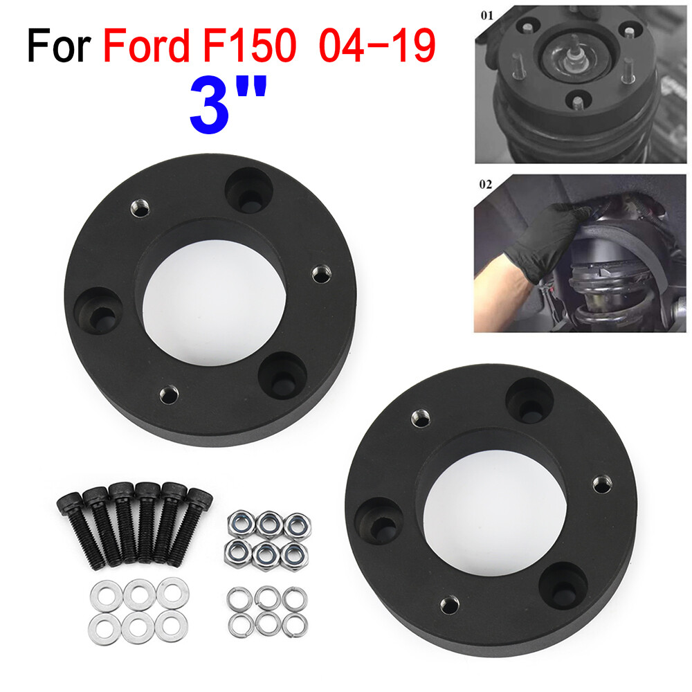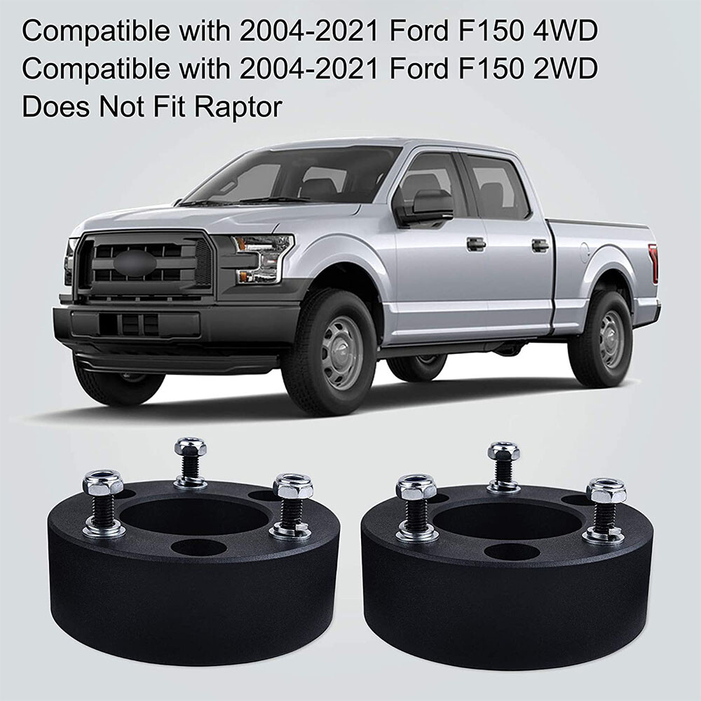 Product description This lifting kit can raise the front of Silverado or Sierra by 3 inches. It can be installed in about 1/2-2 hours, without the need to remove the support/coil like other kits. They are CNC machined from billet aluminum and then match the powder coating black to your factory suspension. The quality of the kit is not comparable to the welded gaskets over time. These gaskets are the strongest gaskets on the market, with 100% satisfaction guarantee and lifetime warranty. Come to you to complete all the hardware and instructions. Applicable models Fit For Ford F150 2004-2019 2WD & 4WD Does not fit 2010-2014 Ford Raptor Please note: Lift spacer thickness and lift is not a 1 to 1 ratio due to the suspension geometry. Material:High quality 6061 Billet aluminum Colour: Black Lifting height] 3 inch Package Include: 2x lift front spacers And screws