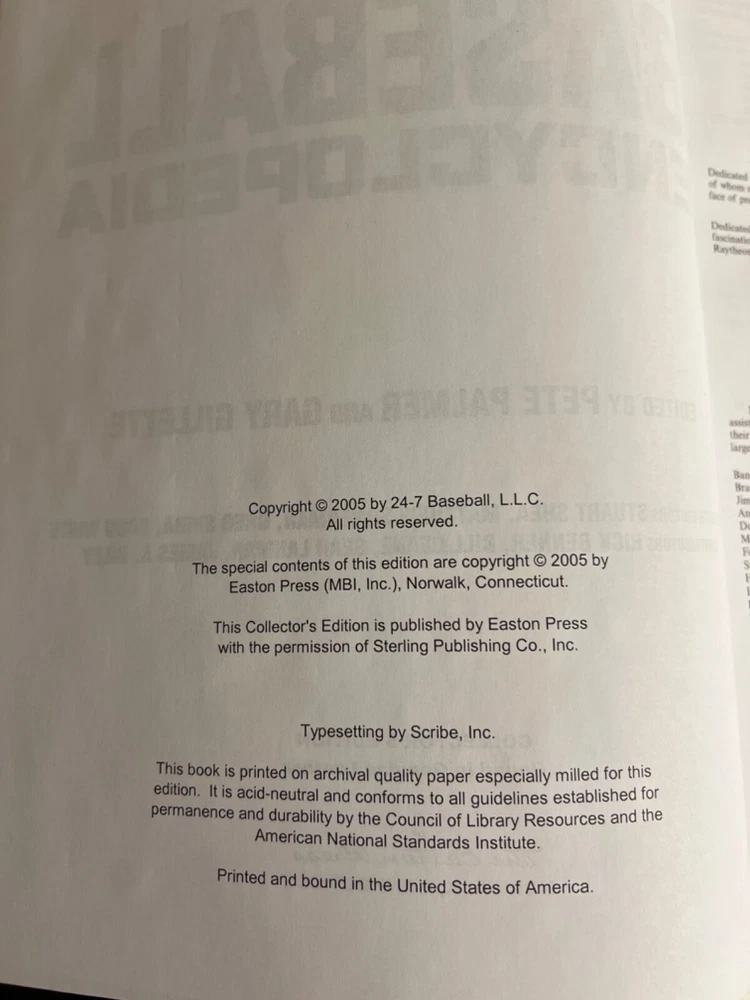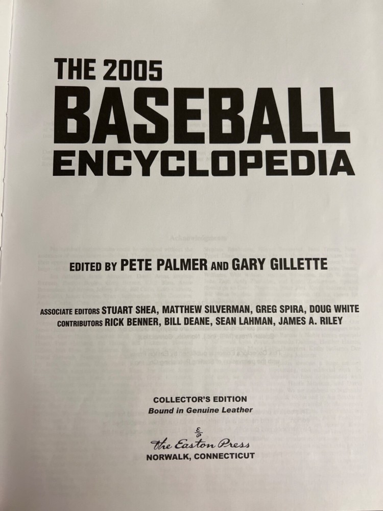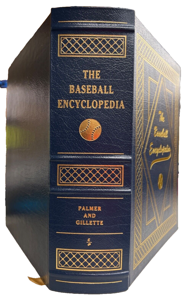 The 2005 Baseball Encyclopedia - Edited by Pete Palmer and Gary GIllette. Published by The Easton Press. Hard cover with navy leather covered boards. The title and decorations are stamped in gold on the cover and the spine. The spine has four raised bands. The pages are edged in gilt on the top, bottom and sides. There are two ribbon bookmarks. Approximately 9"x11-1/2". 1,715 pages. We are happy to provide additional photos and information upon request. See our other listings in store PBSales. We will discount shipping of multiple items in a single package when possible. Please ask for a combined invoice before paying for your items. 100% of the proceeds from this purchase directly fund the operations of public / not-for-profit library in Connecticut.