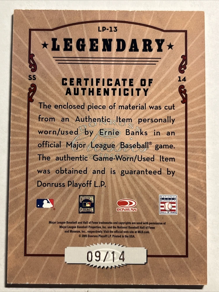 Capture a piece of baseball history with the 2005 Donruss Classics - Legendary Players Jersey card #LP-13 featuring the legendary Ernie Banks of the Chicago Cubs. This exclusive memorabilia, with a limited print run of just 14, is a must-have for collectors and fans alike, offering a tangible connection to the storied past of America's favorite pastime. Adorned with authentic jersey fabric and sporting the iconic Cubs colors, this card celebrates the legacy of one of baseball's greats. It's part of the renowned 2005 Donruss Classics set, known for its quality and prestige among enthusiasts. While not autographed, its rarity and specific card number LP-13 make it a standout addition to any collection.