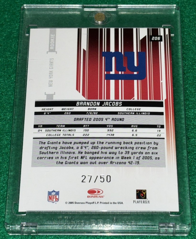 THIS LISTING IS FOR A 2005 LEAF ROOKIES AND STARS BRANDON JACOBS ROOKIE AUTOGRAPH ROOKIE CARD JERSEY NUMBER SP STAMPED 27 of 50 . A SUPER RARE AND UNIQUE ONE OF ONE ROOKIE AUTOGRAPH OF THE NY GIANTS ALL TIME RUSHING TOUCHDOWNS LEADER BRANDON JACOBS. SUPER FAST SAME DAY USPS SHIPPING WITH TRACKING AND DELIVERY CONFIRMATION WILL BE $4.95 BE SURE TO CHECK OUT OUR OTHER CARDS WE HAVE FOR SALE RIGHT NOW. THANK YOU.