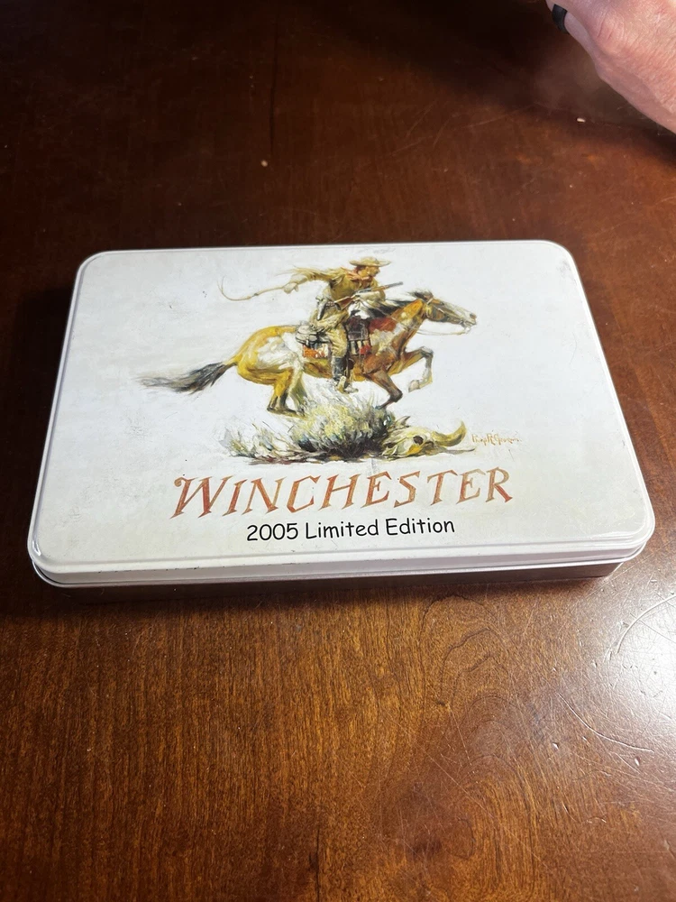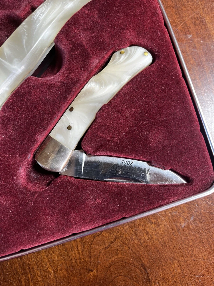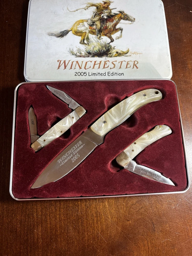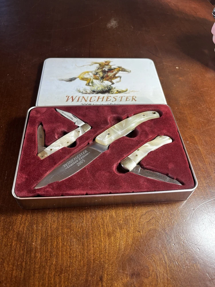 This 2005 Limited Edition Winchester 3 Piece Knife Set is a must-have for any collector or outdoor enthusiast. The set includes a Winchester brand knife with a classic model design, featuring a pen or straight back blade type with beautiful ivory color handles. This knife set also comes with a sheath and tin, making it a perfect gift for anyone who loves factory manufactured modern folding knives. The knife set is categorized under Collectibles, Knives, Swords & Blades, Collectible Folding Knives, and Modern Folding Knives. With four blades in total, this knife set is perfect for everyday use or for special occasions. Get your hands on this limited edition Winchester knife set today and add it to your collection! Handles appear to be mother of pearl, I cannot guarantee this. This is in the tin, but cannot guarantee it has not been used. It looks new. Sheath fits large knife. Great condition. Please see all pictures of wear and condition. Selling as -is.