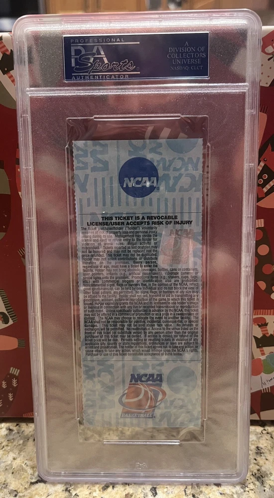 Ticket from the Elite 8 game in which Illinois scored 14 points in 3:33 to force overtime where the Illini prevailed 90-89. One of the most exciting games of the tournament. Card is graded PSA 8 near mint. Slab has a couple scuff marks on the edge. Please see photos.