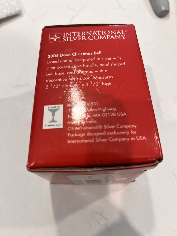 Add a touch of elegance to your holiday decor with this stunning 2005 International Silver Co. Silverplated Dove Bell Ornament. This beautiful ornament features a delicate dove design with a bell chime that adds a charming touch to any room. Crafted with high-quality silver plating, this ornament is perfect for collectors and enthusiasts alike. The ornament is 3.5 inches high and comes with a set that includes one ornament. It is a great addition to any ornament collection and makes for a fantastic gift. Celebrate the holiday season in style with this exquisite ornament. Item appears to be new. The box still shines and the ornament appears professionally wrapped. We got this at an estate sale and I won’t be able to wrap it up like factory wrapping.