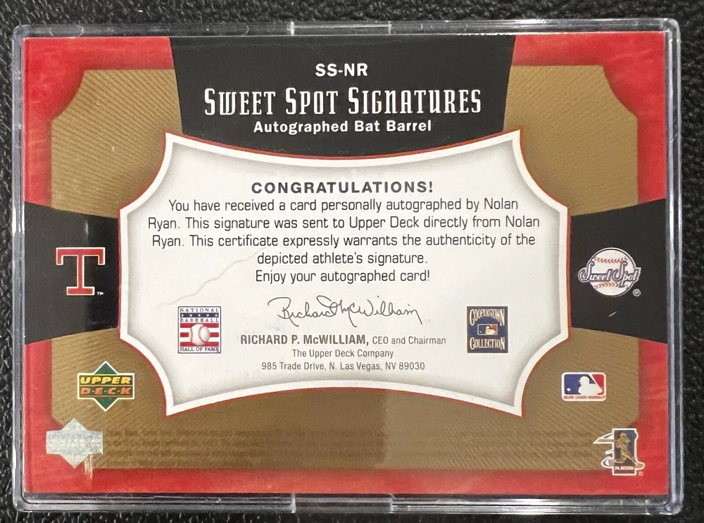 Elevate your baseball collection with the 2005 Sweet Spot Signatures Barrel Blue Ink #SSNR Nolan Ryan card, a gem for enthusiasts and fans of the Texas Rangers. Authenticated by Upper Deck, this card features Nolan Ryan’s hard-signed autograph, underscored by a limited print run of just 15, making it a rare and valuable find. The card belongs to the esteemed 2005 Sweet Spot set and is distinguished by its Signatures Parallel/Variety, capturing a piece of Major League Baseball history. Serial numbered for exclusivity, this sports trading card is a tangible tribute to the legacy of one of baseball's most iconic pitchers.