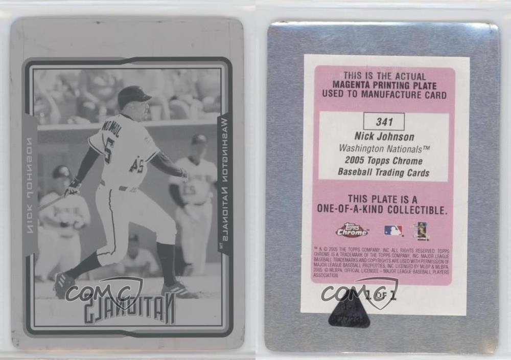 Sport:BaseballTeam:Washington NationalsParallel/Variety:Printing Plate MagentaLeague:Major League Baseball (MLB)Features:Serial Numbered, One of One, Base Set, Parallel/VarietySet:2005 Topps ChromeSeason:2005brand:ToppsManufacturer:ToppsPlayer/Athlete:Nick JohnsonPrint Run:1Series:Topps ChromeCard Number:341