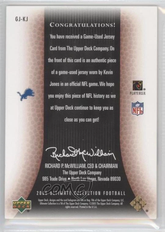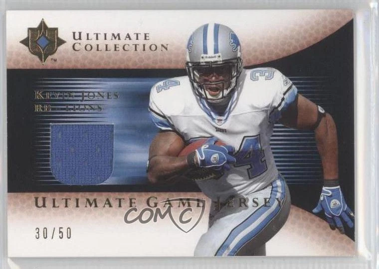 2005 Ultimate Collection - Ultimate Game Jerseys - Gold #GJ-KJ Kevin Jones Qty Made: 50 - Football Card - Featuring the Detroit Lions - Featuring Kevin Jones Search for more: 2005 Ultimate Collection Search for more: 2005 Ultimate Collection - Ultimate Game Jerseys - Gold View all of our Listings Auctions Buy It Now About Us Located in the beautiful Pacific Northwest, COMC (Check Out My Cards) is the world's largest consignment service for trading card singles. More than 10,000 people have used our consignment service to list over 50 million trading cards. We currently house 20 million cards, each listed for sale with front and back images of the actual card. Find out how we can help you consign your items on eBay by contacting us through eBay messaging. COMC -- "The Safe & Easy Way to Buy & Sell" Representative Image - Select Specific Item above to see image of actual item Representative Image - Select Specific Item above to see image of actual item Raw Condition for Modern Cards Unless otherwise noted, raw modern cards are listed in Near Mint-Mint condition or better. A NM-MT card appears to be Mint at first glance, but upon closer inspection, may exhibit some of the following: minor print defects (e.g. roller marks, print line, dimple), minor scratches, slight edge wear, and slight corner wear. Centering is clearly visible in the images provided and does not factor into our condition assessment. Raw Condition for Vintage Cards Unless otherwise noted, raw vintage cards are listed in Excellent condition or better. An EX card may exhibit some of the following: minor rounding of corners, surface wear, print defects, light scratches, and slight edge wear/chipping. Centering is clearly visible in the images provided and does not factor into our condition assessment. Domestic Shipping Combined shipping for multiple items is available. To receive combined shipping, please ensure all desired items are in your eBay shopping cart before proceeding to checkout. eBay limits orders to 40 items per order. We automatically combine multiple orders placed on the same day. If you place multiple orders on the same day, please contact us to request a refund of applicable shipping costs. Signature confirmation may be required on invoices over $400. Raw cards are shipped in toploaders. International Shipping COMC offers eBay's International Shipping (EIS) for international orders under $2,500* (see country exceptions below). All duties and import fees are paid at checkout; in the rare event that there are additional import fees upon delivery, these are borne by the buyer. EIS packages route through a shipping hub in Erlanger, KY before shipping to their final destination. Please note that EIS does not allow for combined shipments. The shipping rates are determined by eBay and cannot be adjusted. *Maximum sale price exceptions: Colombia, Kuwait ($2,000); Taiwan ($1,539); Chile, Costa Rica, Guatemala, Honduras, Trinidad and Tobago ($1,000); Antigua and Barbuda, Aruba, Belize, Dominica, Grenada, Philippines, Saint Kitts and Nevis, Saint Lucia, Montserrat, Turks and Caicos Islands ($500); Dominican Republic, El Salvador ($200). Please request a shipping quote through eBay messaging for orders that exceed the maximum sale price supported by eBay's International Shipping. You will be responsible for all duties and import fees for international orders shipped outside the EIS. Raw cards are shipped in toploaders. Payment COMC does not accept offers on our cards through our eBay storefront. COMC utilizes eBay’s managed payments system. If you are experiencing difficulties making a payment, please contact eBay for assistance. Return Policy Returns are only accepted on the rare occasion the item is not as described. If you are making a return, please initiate the return process through eBay so a mailing label can be provided for you. Prior to listing, our expert team carefully assessed this item to represent it accurately. Please review the description and high-definition images prior to purchasing to ensure this item meets your satisfaction. We welcome you to contact us if you have further questions about this item. Trust and Integrity COMC carefully assesses each item consigned to us to prevent fraudulent items from entering the marketplace. If you believe an item offered on COMC may be fraudulent, please contact us with details so we can investigate the issue. Items we determine are outside our supported items policy may be removed. Last Modified: 1/2/2025 7:48:44 AM PDT