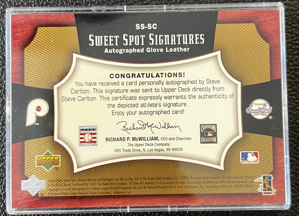 Delve into the world of sports memorabilia with the 2005 Upper Deck Sweet Spot Signatures Steve Carlton Glove card. This exceptional collectible, numbered SS-SC, is a treasure for any baseball enthusiast, featuring an authentic autograph by the legendary Philadelphia Phillies pitcher. Its limited print run of just 15 makes it a rare and coveted piece for your collection. The card not only boasts a signature but includes a memorabilia piece, showcasing Steve Carlton's glove. As part of the esteemed 2005 Upper Deck Sweet Spot set, it reflects the quality and prestige associated with one of the most renowned series in sports trading cards. Whether you're a fan of Carlton, a Phillies supporter, or a collector of rare sports artifacts, this card is a significant find.