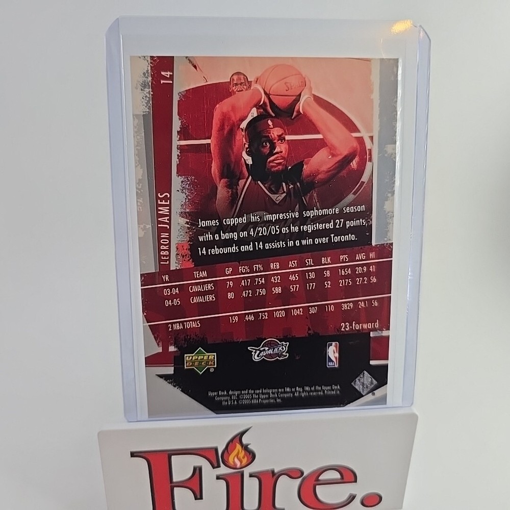 This is a 2005-06 Upper Deck Slam trading card featuring LeBron James of the Cleveland Cavaliers. It is part of the base set, card number 14, and is an original licensed print. The card is standard size and is from the National Basketball Association (NBA). It does not have an autograph and is not a vintage card. It is a sports trading card manufactured by Upper Deck. Thank you for your interest, don't let it get away bid today!