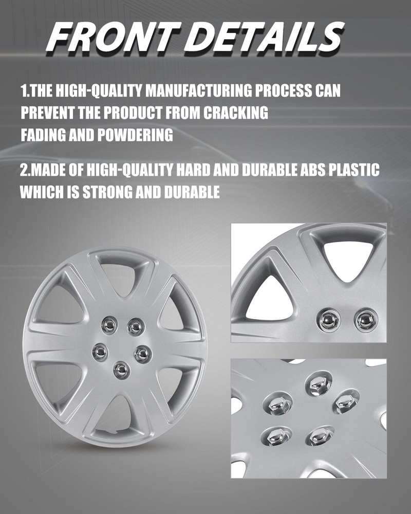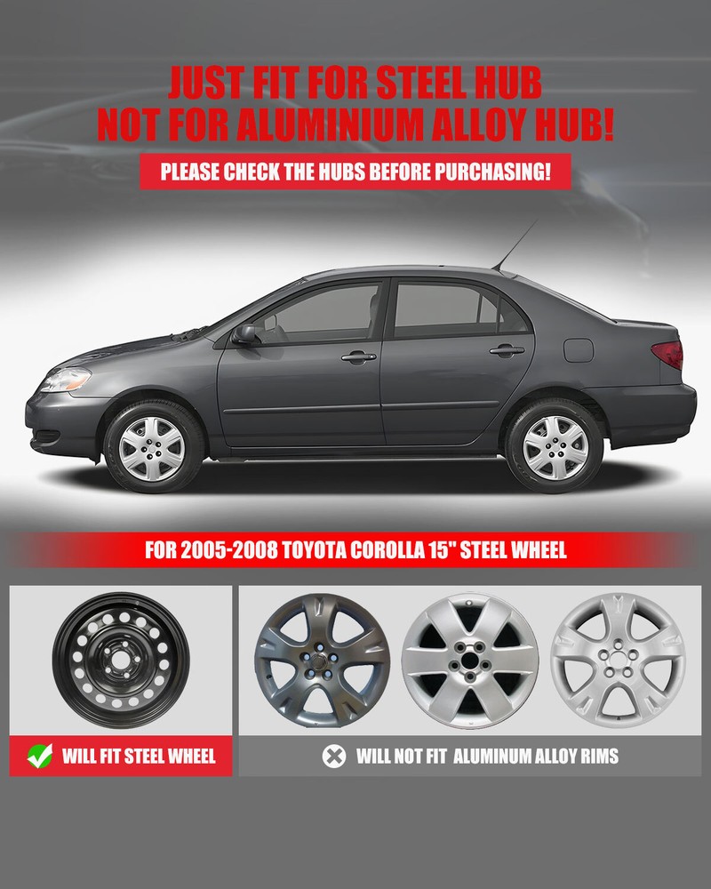 Store Categories Other Car Refrigerator Front Bumper Rear Bumper Fender Flares Inner Fenders Side Steps Running Board A-Pillar Light Mount Brackets Headlights Taillights Fog Lights LED Headlights LED Taillights LED Fog Lights Jeep Chevrolet Ford Toyota Dodge GMC Wheel Covers Features ✴ PERFECT FIT: This wheel hub cap is specifically designed to perfectly fit for 15-inch wheels, ensuring a seamless match and enhanced aesthetics. It complements the overall design of the vehicle, elevating its visual appeal. ✴ HIGH-QUALITY MATERIAL: Constructed from high-quality materials, this wheel hub cap guarantees durability and longevity. It withstands various road conditions and environmental factors encountered during daily driving, maintaining its pristine condition. ✴ EASY INSTALLATION: Installing this wheel hub cap is a breeze and requires no specialized tools or modifications. It comes with a user-friendly system, allowing for a hassle-free installation process by following the provided instructions. ✴ PROTECTIVE FUNCTION: Besides its aesthetic appeal, this wheel hub cap serves as a protective barrier for the wheels. It prevents scratches and potential damage caused by stones, debris, or other objects, safeguarding the wheel's surface. ✴ AFTER-SALES SERVICE: If There Is a Loss of Product Parts, or Any Parts of The Problem, We Can Provide After-Sales Service, Please Contact Us on The Order Page. Wheel Covers Specification ✴ Type: Hub caps ✴ Number in Pack: 4 ✴ Color: Silver Lacquer ✴ Material: ABS ✴ Compatible Wheel Diameter: 15 in ✴ Finish: Glossy ✴ Installation Type: Snap-On ✴ Model: For 2005-2008 Toyota Corolla Wheel Covers Package ✴ 1 Set of 4 Hub caps and 4 retention rings Payment Delivery details Terms of sales About us Contact us Payment We accept PayPal, credit card , Apple Pay & Google Pay etc. Delivery details All items will be shipped within 1-3 business days after payment received, we will try our best to ship out as soon as we can, hope for your understanding. Please double confirm your address and contact information, which will help the delivery faster and more accurately. Note :buyers who purchase international products need to pay import tariffs!!! Terms of sales Professional installation is highly recommended. Any problem of the item please feel free to contact us first , please D o Not leave negative feedback before that, or simply return it within 60 Days in original condition. We will resolve it for you ASAP. About us Any questions please do not hesitate to contact us directly by eBay message . We will reply you within 24 hours asap, thanks for your understanding. Contact us Should you have any problem or require any further information please feel free to contact us . If you are satisfied with our product and service, please kindly leave us a positive feedback. Popular Categories On Mar 14, 2025 at 20:38:08 PDT, seller added the following information: