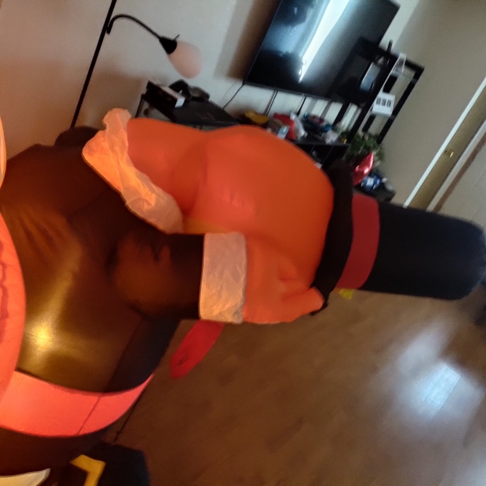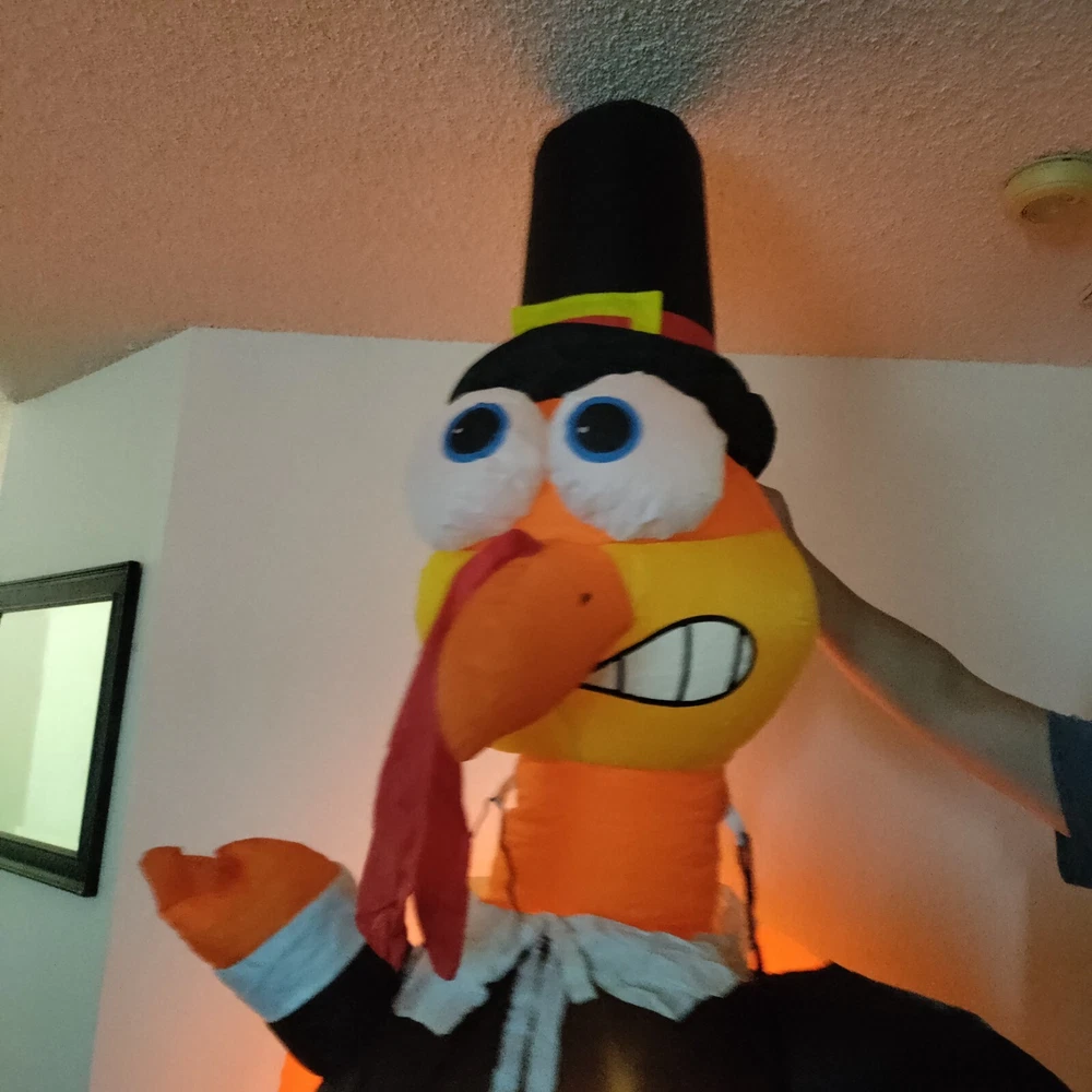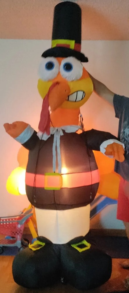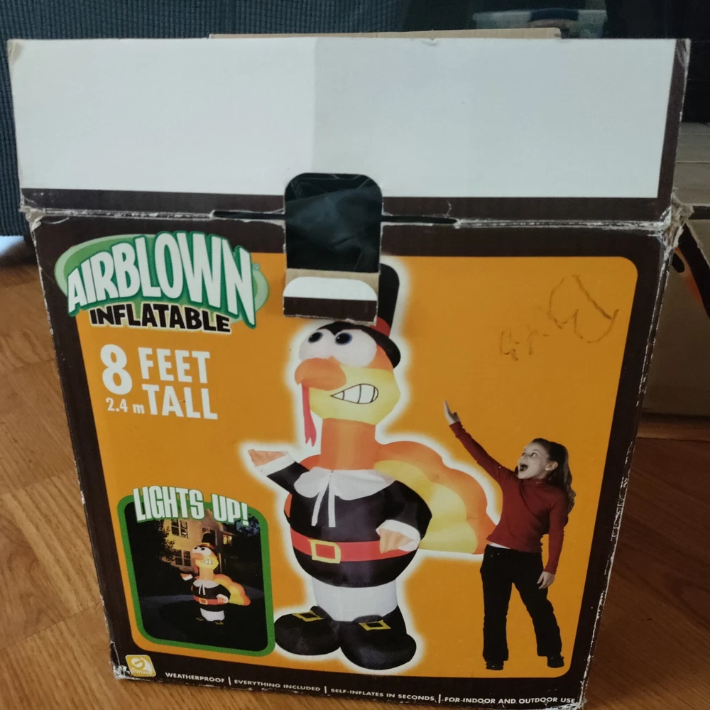The inflatable doesn't stand straight and he bends at his neck. The box is damaged and doesn't have a top. There is a spot where the tail and the back of the turkey were supposed to be connected but looks like it came apart. Please see pictures. Lights up. Some of the clips to tie down the turkey are broken. USPS Ground Advantage and USPS Priority shipping available.