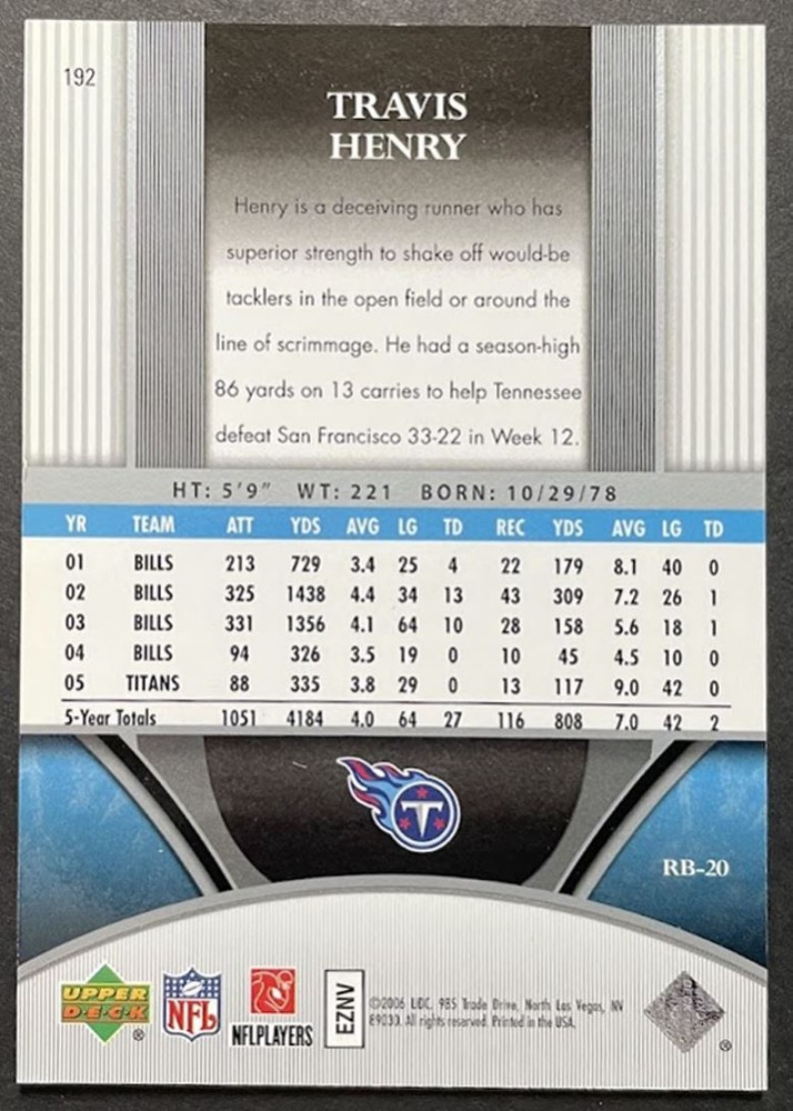 About Me Other Listings Feedback Add to Favorites Contact Me eBay Store Calgary Card Shop 2006 Upper Deck Ultimate Collection Travis Henry 519/525 Tennessee Titans #192 No stock photo / These are real scans or pictures Details Description: Travis Henry Category: Football Year: 2006 Product: Upper Deck Ultimate Collection Team: Tennessee Titans Card Number: 192 Serial Number: 519/525 Dimensions: 3½" x 2½" SKU: FT B00001 R01 H (16) Shipping Shipping Canada: Lettermail or Registered Mail, Expedited Parcel Combined Shipping Free United States: USPS First Class Combined Shipping $0.50/each USPS First Class Listing By Kronocard trading cards software v2.8.2.3