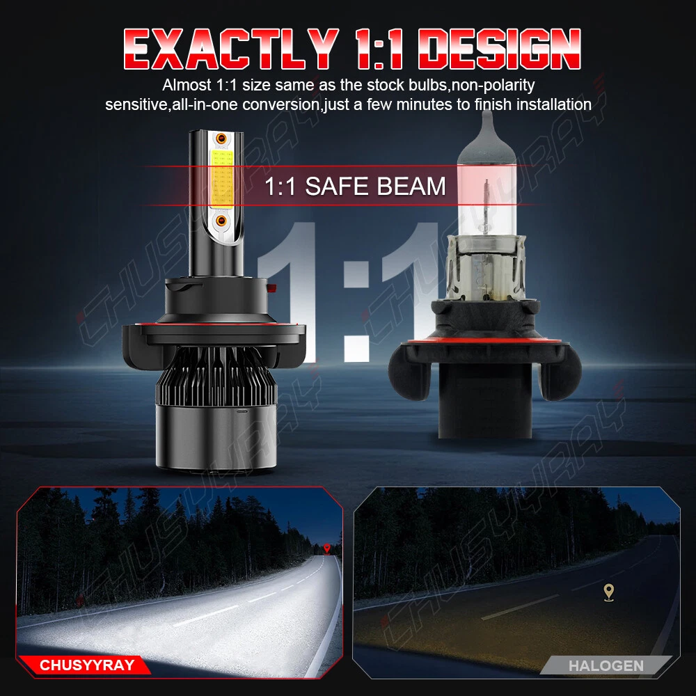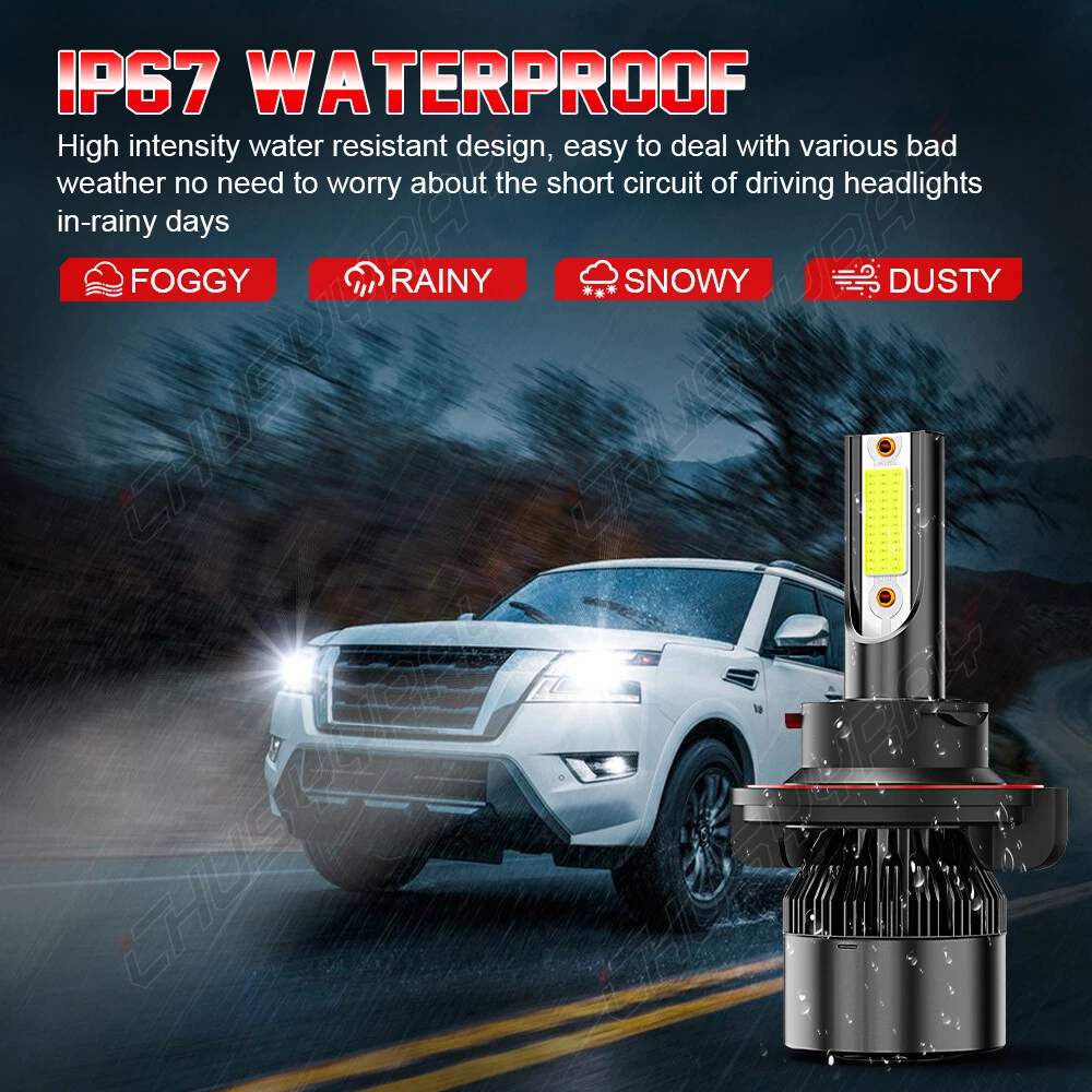 Note: a) Compatible List can not show up all car model, IF your car plug is SAME, the item is fit your car. b) These bulbs will work with most vehicle's computer system without error. If you are unsure the item fit or not , please do remember send message to tell us your car make, model, year and other information which is helpful to check the item fit or not. For example: For Ford Fiesta 2019 Diesel Van 1.4 TDCi FWD VI -- For Ford Transit 2013 Diesel Platform/Chassis 2.4 TDCi RWD RWD -- FM_ _,FN_ _ H13 LED Headlight: Plug Type: H13/9008,Hi-Lo Beam Power(per set): 50W@high beam, 25W@ low beam LED Quantity(each bulb): 2pcs* COB chips Luminous Flux: 12000lm/set(6000lm/bulb) Operating Voltage: DC 9-32V(fit 12V,24V vehicles) Color Temperature: 6000K IP68 rated water and dust seal,over 50000hrs lifetime Beam Angle: 270 degree@low beam,360 degree@high beam Material: Aviation 6063 aluminum profile Operating Temperature: -40-80 degree Celsius Usage: headlight (2pcs/set)H13 COB Hi-Lo Beam LED headlight conversion kit Latest COB chip (USA) light source,3 luminous faces(270/360 degree) no blind zone Engineering beam pattern design throw more light on road evenly at appropriate angle without foggy light Xenon white light reflect road paint/signs better to show clearer road situation during night driving 270 degree low beam angle with cut-off line,will not dazzle oncoming traffic All-in-one heat conduction+high speed mute fan system keep the light bulb in appropriate working temperature Built-in constant current CPU, instant full brightness without start-up relay Two-way heat dissipation channel 1.All-in-one aluminum profile as heat conduction system, 360 degree heat radiating 2.High speed mute fan (12000R/Min),high Air flow for faster cooling rate H11 LED Fog Lights: Specification: Plug Type: H11/H9/H8/H16, Universal Power: 50W Lumens: 1200 lm *2pcs Lamp beads: 3030 lamp beads Operating Voltage: DC 9-20V Color Temperature: White 6000K Light color: white Material: Aviation 6063 aluminum profile Operating Temperature: -40-80 degree Celsius Lifetime: 50000 hours above Package Included: 2x H13 LED headlight bulbs 2 x H11 Fog Light bulbs