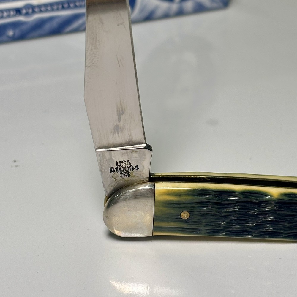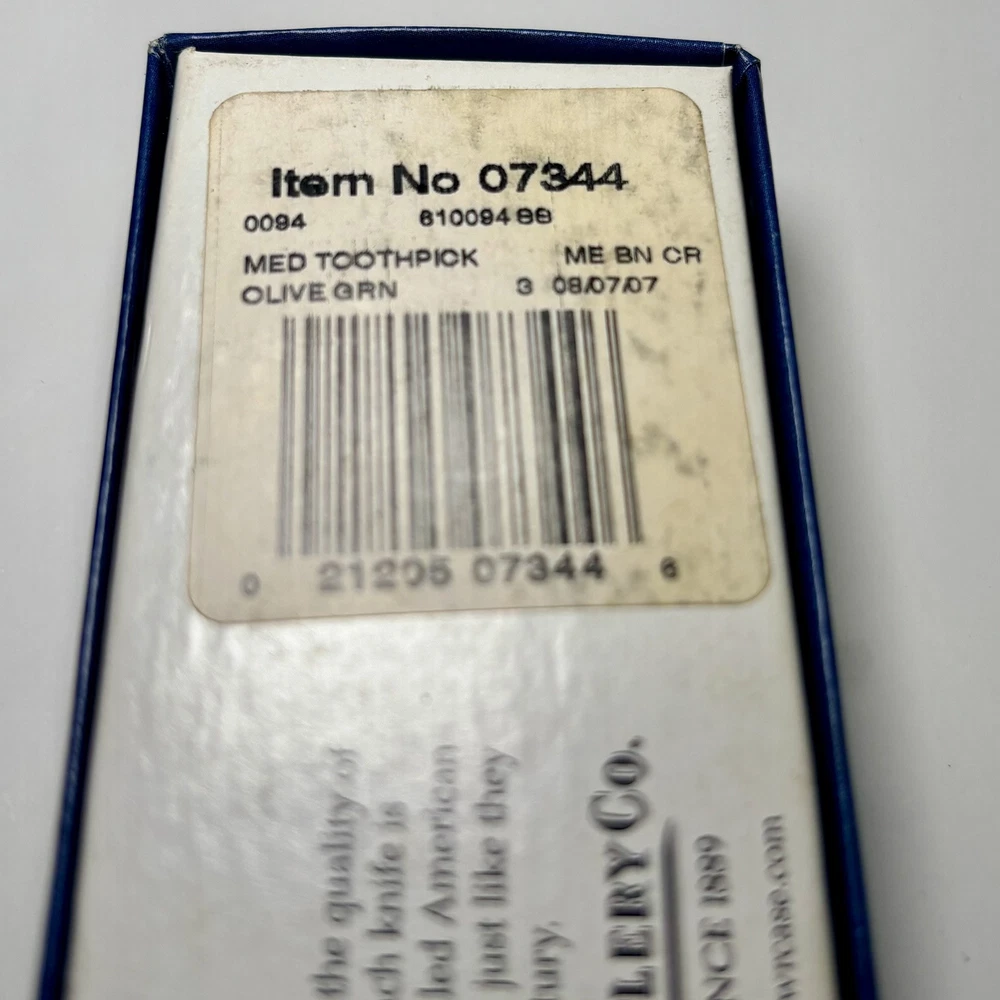 The Case XX 2007 Medium Texas Toothpick Olive Green Bone 610094 by Crandall Cutlery Co. is a collectible folding knife with a 2.76 - 4in. stainless steel clip point blade. It features a manual opening mechanism, ambidextrous dexterity, a plain edge, and a unique green bone handle. With a toothpick tool and made in the United States, this original piece is a valuable addition to any knife collection.