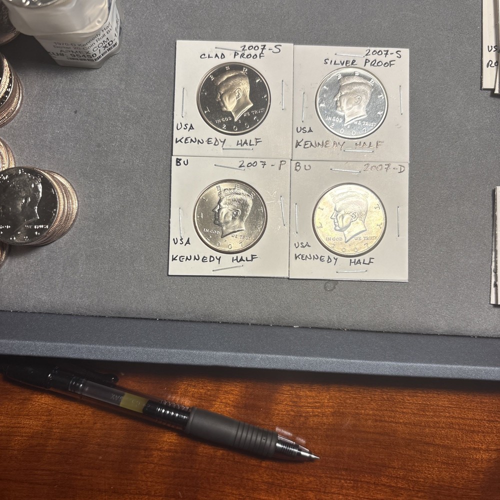 2007 P D S S Kennedy Half Dollar Year set Silver & Clad Proof & BU US 4 Coin lot Four Coins: 2007 P KENNEDY BU 2007 D KENNEDY BU 2007 S CLAD PROOF 2007 S SILVER PROOF 0.900 These coins come from mint rolls so there may be minor U.S. Mint contact marks on your coin. I'll send you the best coins I have. All grades in pics are approximate and unofficial