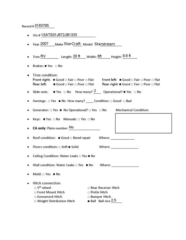 Vehicle Information Year: 2007 Make: Starcraft Model: Star Stream Condition: Used Description 2007 StarCraft Star Stream 20’ RV 2 Slides One Owner Modern Sleek Look Location Stockton, CA 95206 Ball 2.5” Clear title Pickup Only Sold AS IS Terms of Auction Auction Terms and Conditions: · All vehicles sold through our auctions are generous donations made to our charity. These vehicles are presented for sale based on the information and images provided by the donors. · Discrepancy Reporting: In the event that a buyer or his agent discovers a major discrepancy between the auction listing and the actual vehicle at the time of pickup, we urge the buyer not to pick up the vehicle. Instead, please take pictures and promptly contact us via eBay. · Inspection and Acceptance: Once the buyer or their authorized agent takes possession of the vehicle, no allowances will be made for any defects or damage. It is the responsibility of the buyers or his agent to thoroughly inspect and accept the vehicle in its current state. · "As Is" with "No Warranty": Please be aware that all vehicles are sold "As Is" with absolutely no warranty. Buyers should understand that they are acquiring the vehicle in its current condition. · No Legal Recourse: Buyers acknowledge that there will be no legal recourse available to them should they discover any defects in the vehicle after it has been picked up. · Ask Questions Before Bidding: To ensure you have a clear understanding of the vehicle's condition, we strongly recommend that buyers ask any questions they may have about an item before placing a bid, response provided within 24 hours. · Binding Contract: Placing a bid on an item is a commitment and constitutes a binding contract. By bidding, the buyer commits to purchasing the item should they win the auction. · Non-Paying Winners: In the interest of maintaining the integrity of our auction process, non-paying winners will be reported to eBay. This underscores the importance of fulfilling your commitment to purchase. · Payment and Pickup: Payment for vehicles must be made within 48 hours of the auction's conclusion. Furthermore, buyers are required to pick up the vehicle within 10 days after the auction's end, unless alternative arrangements have been agreed to before the auction ends. · Shipping: Please note that we do not provide shipping services. · Payment Processing: Be aware that payment may take 24 to 48 hours to clear. After payment clears, buyer will receive pick up instructions. Buyers are required to schedule an appointment for vehicle pickup. By participating in our auctions, you agree to abide by these terms and conditions. These terms and conditions provide clarity and protect the interests of both the buyer and the seller, ensuring a transparent and fair auction process. It's essential for buyers to carefully review these terms and conditions before participating in the auction to avoid any misunderstandings. Options and Standard Features Basic Information Year: 2007 Make: Starcraft Model: Star Stream Stock Number: 3183795 VIN: 1SATS01J672JB1333 Condition: Used Type: Travel Trailer Length (Feet): 20 Title: Clean Slide-Outs & Awnings Slide Outs: 2 Awnings: 0 Terms Of Bidding Commitment to Purchase: When a buyer places a bid, they are making a commitment to purchase the item if they win the auction. Bidding is a binding agreement to complete the transaction. Pre-Bid Questions: It is strongly recommended that buyers ask any questions they may have about an item before placing a bid. This ensures clarity and understanding about the item being auctioned. Feedback Requirement: If a buyer has less than 10 feedbacks on eBay, they are required to contact the seller via eBay messaging before bidding. The seller reserves the right to remove bids from buyers with low, poor, or negative feedback. Serious Bidding: Bidders are urged to bid only if they are serious about owning the vehicle or item being auctioned. Bidding should not be taken lightly, as it is a legally binding contract to purchase. Non-Payment Reporting: All non-paying high bidders will be reported to eBay. This measure is taken to ensure accountability and adherence to the auction terms. Terms of Payment Payment Deadline: The vehicle must be paid in full within 48 hours of the auction end. Any vehicle that is not paid within 48 hours we reserve the right to relist. Payment Options: You have several payment options to choose from, including: Zelle / Quick Pay Cash deposit to our Bank ACH (Automated Clearing House) Wire Transfer Credit Card + 3.5% fee Cash at pick up: Please note that we do not accept cash at pick up Payment Processing Time: It's important to be aware that for some payment methods, it may take 24 to 48 hours to clear. This means that the payment may not be immediately visible as cleared funds. Access Restriction: Access to the yard or the vehicle will not be granted until the full payment has been received and cleared. This policy is in place to ensure that all financial obligations are met before releasing the purchased vehicle. These terms are designed to provide clarity and ensure a smooth payment process for auction participants. Please make sure to follow the specified payment guidelines to avoid any issues or delays. Warranty Vehicle Sold "AS-IS": This vehicle is being sold AS-IS with no warranty expressed, written, or implied , regarding the condition or performance of the vehicle. Description and Authenticity: The Seller shall not be responsible for the correctness of the description, authenticity, genuineness, or defects of the vehicle. Any descriptions or representations are for identification purposes only and should not be construed as a warranty of any kind. No Allowance for Imperfections: The Seller will not make any allowance or compensation on account of any incorrectness, imperfection, defect, or damage found in the vehicle. Buyers should be aware that they are purchasing the vehicle in its current condition