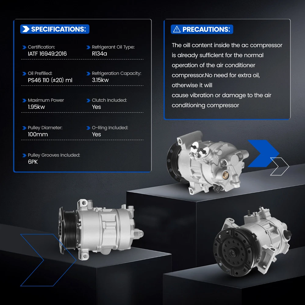 Pulley Groove Quantity: 6 Manufacturer Warranty: 1 Year Manufacturer Part Number: RL058228AI, 98395,158301, 20-22689-AM Power: 45W Interchange Part Number: CO 11023C, 5058228AE, 5058228AF, 5058228AH, 505822 OE/OEM Part Number: Does not apply Voltage: 12V UPC: Does not apply Material: Copper, Iron, Aluminum gtin13: Does not apply Type: A/C Compressor Brand: Unbranded Oil Type: PAG 100# Current: 1.5-2.5A