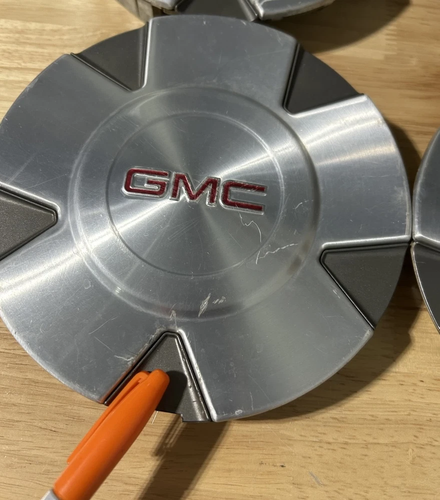 The product is a 4-pack of aftermarket wheel center caps designed for 2007-2012 GMC Acadia vehicles. They are made of plastic with a polished aluminum finish and feature the GMC emblem. The manufacturer part number is 9596977. These center caps are suitable for the rear, left, front, and right placements on the vehicle. The order contains all four center caps. Some do have some scratches and scuffs, which I pointed out in the pictures no cracks and all the tabs are intact. Please verify with the part number prior to making a purchase for a better fit fee of vehicle. If a return is needed, please contact us prior to making a return request. If satisfied with product and service positive feedback is greatly appreciated. Thank you.