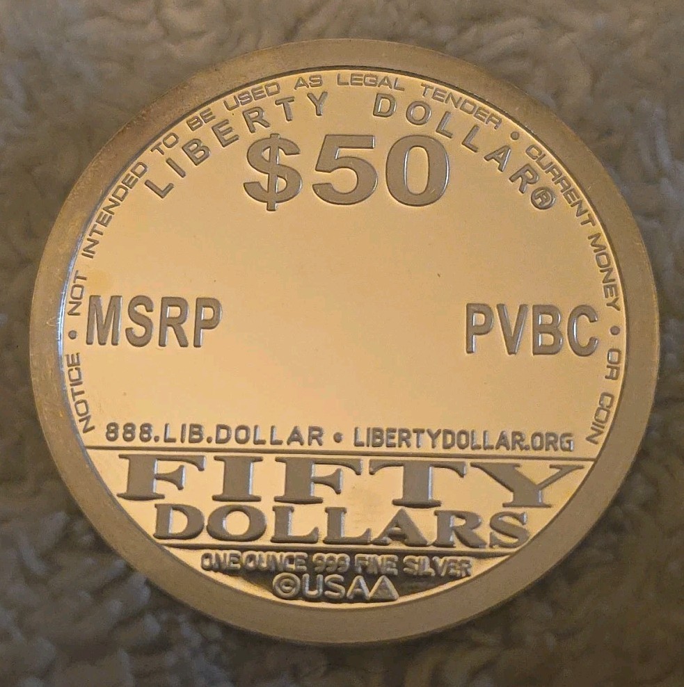 The 2008 American Liberty Dollar $50 .999 Silver 1 oz Coin is a round, proof coin minted by the American Liberty Dollar. This coin, with a fineness of 999 and a precious metal content of 1 oz, is a valuable addition to any collection or investment portfolio. Featuring a blank back design, this coin is a unique and rare find for collectors and investors alike. Made of silver and bearing the symbol of the United States, this coin is a special piece of history that holds both numismatic and precious metal value.