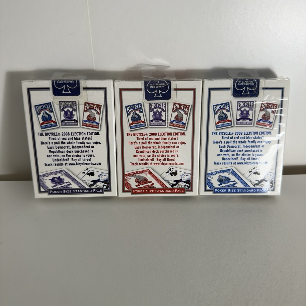 This product is a very rare full set of playing card decks from the 2008 Bicycle Election Edition. This collectible item features the iconic Bicycle brand and is a unique addition to any collection of paper playing cards. With this set, collectors can enjoy not only the classic game of playing cards but also a piece of political memorabilia from the 2008 election.