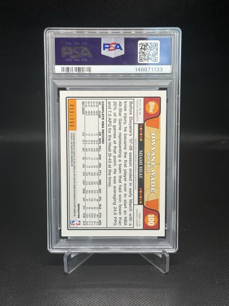 The product is a highly sought-after 2008 Dwyane Wade Topps Chrome Orange Refractor trading card with a print run of 499 and graded as a PSA 10 Gem Mint. This sports trading card features the Miami Heat player in the National Basketball Association (NBA) and is an original from the 2008 Topps Chrome set. The card is in English, manufactured by Topps, and includes a serial number, making it a valuable collectible for basketball fans and memorabilia enthusiasts.