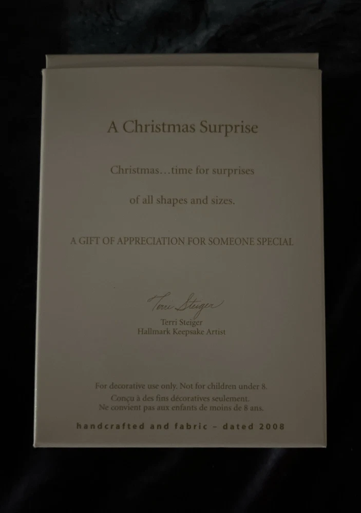This 2008 Hallmark A Christmas Surprise ornament is a wonderful addition to your holiday decor. The ornament features a cute surprise design that is perfect for Christmas enthusiasts of all ages. Made by Hallmark, this ornament is of high quality and is sure to last for years to come. With a brand name like Hallmark, you can trust that this ornament is made with care and attention to detail. It is a great choice for anyone looking to add a touch of festive charm to their home. Whether you're a collector or just looking for a unique decoration, this ornament is sure to delight.