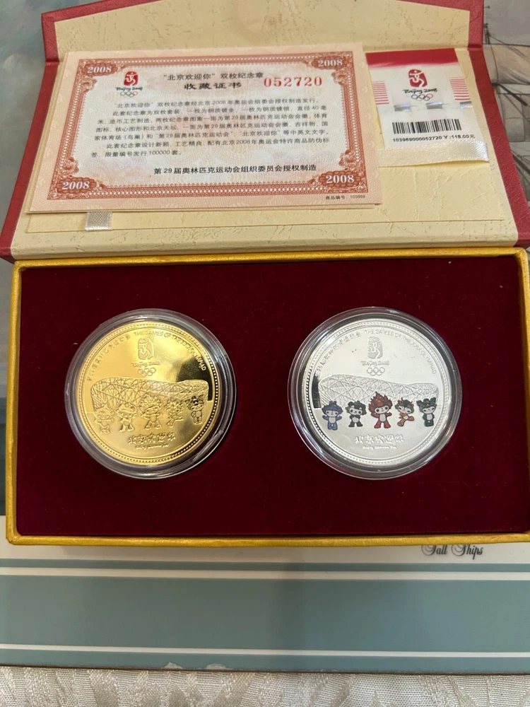 2008 OLYMPIC BEIJING 2 COIN PROOF SET COA & BOX- 1 SILVER PLATED-1 GOLD PLATED