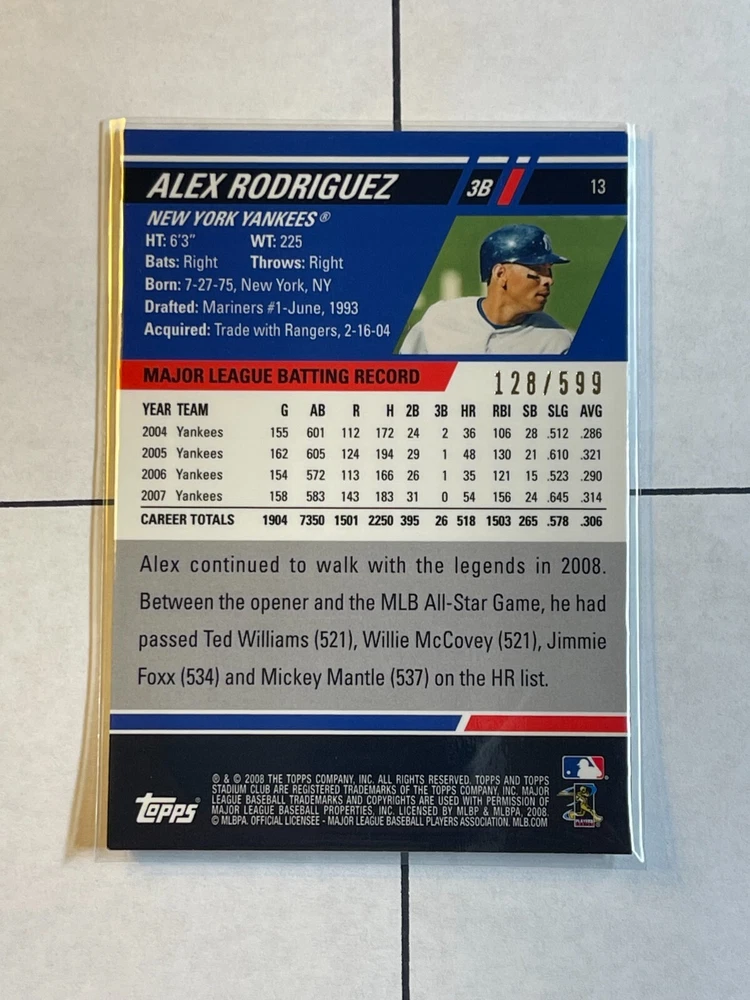 Card is in excellent condition suitable for grading (See pics). Very cool parallel limited to only 599 total copies. These are classic parallels from 90s Stadium Club and are not easy pulls. Always a good time to invest in the greats of the game like A-Rod. I will combine shipping for multiple items so please check out my other listings!
