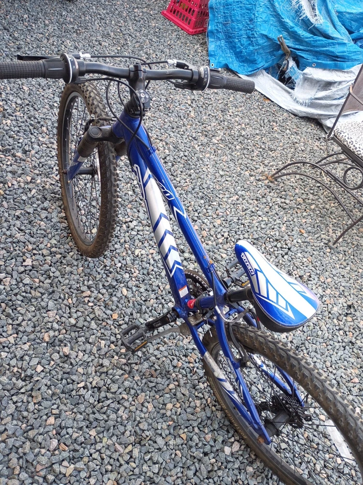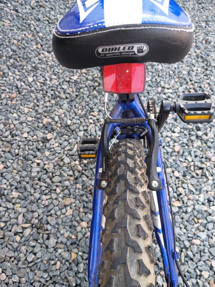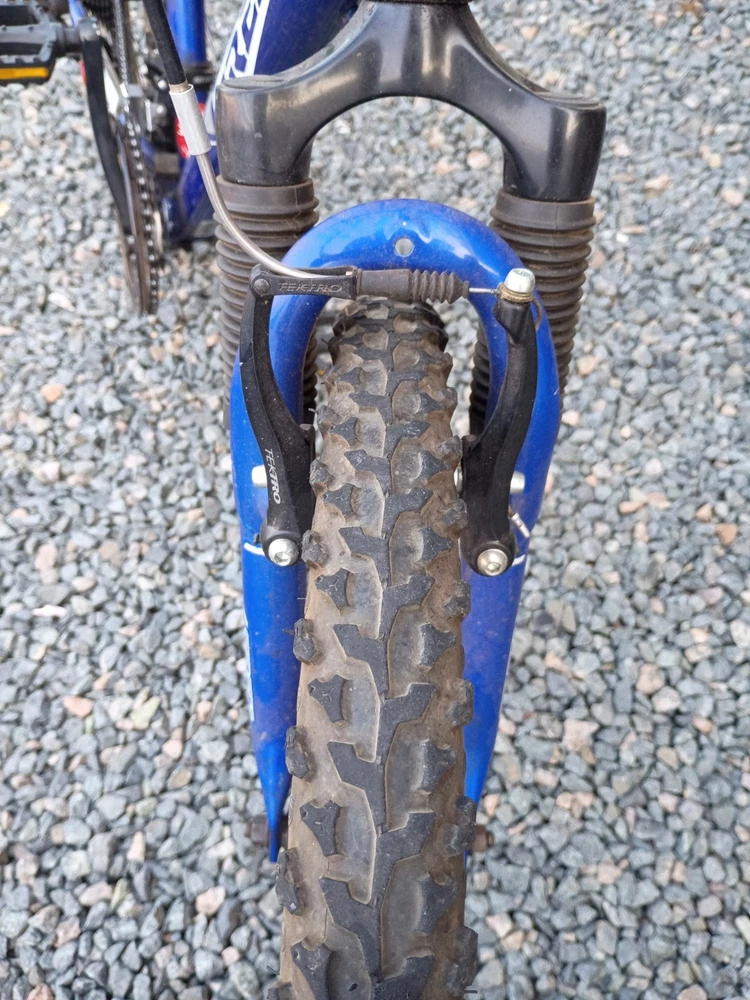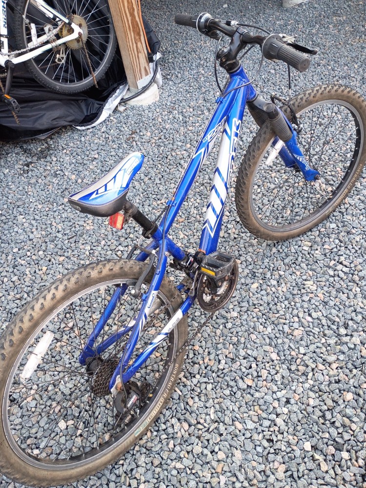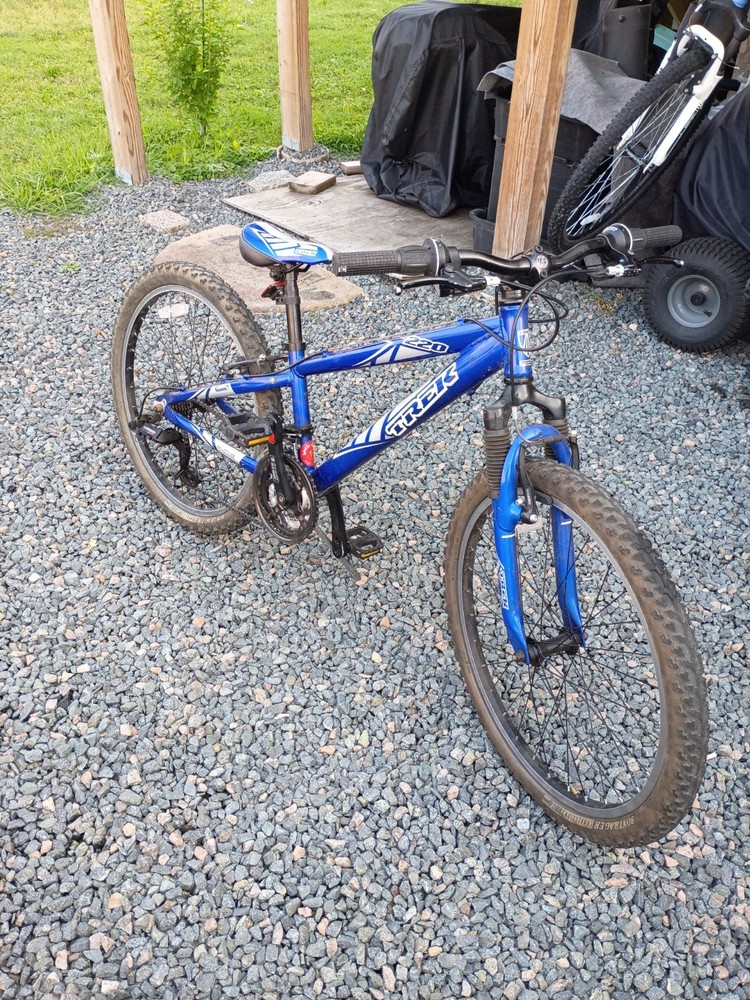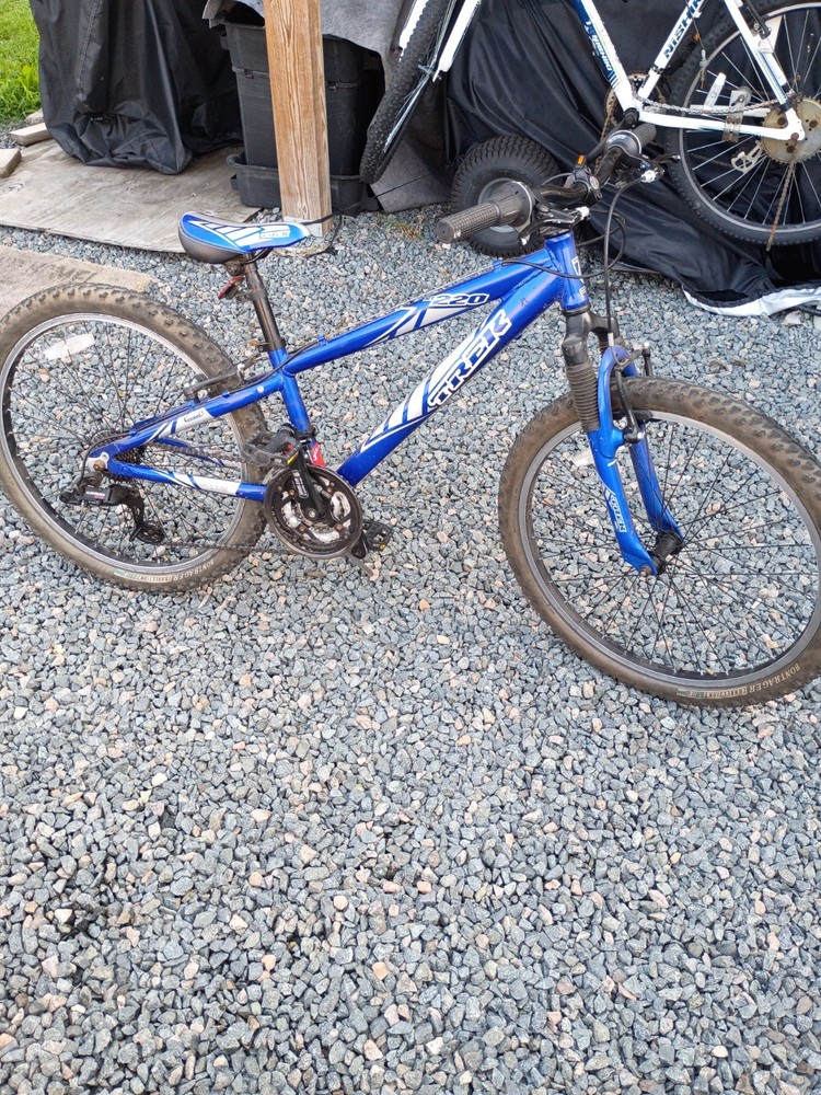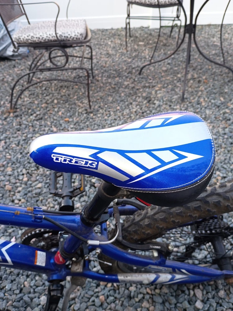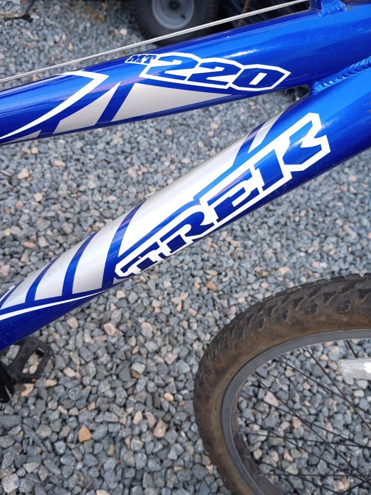 The 2008 Trek MT220 Youth Mountain Bike is a high-quality, durable bike designed specifically for young riders. With a 12" aluminum frame and front suspension, it provides a smooth and comfortable ride on various terrains. The 24" wheels and 21-speed grip shifter make it easy to tackle trails and enjoy the outdoors. This blue bike is lightweight, easy to maneuver, and features a step-through frame and adjustable seat for added convenience. With V-brake technology and derailleur gears, this Trek mountain bike offers a reliable and safe riding experience for children.