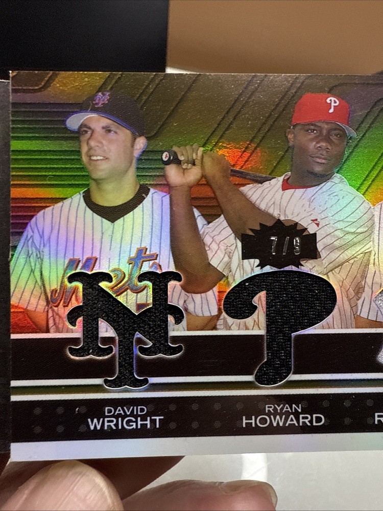 The product is a 2008 Triple Threads Booklet featuring baseball legends Mickey Mantle, Joe DiMaggio, Ted Williams, and Alex Rodriguez, Ryan Howard, and David Wright. The card is made of card stock and only 9 in existence. It is an original release by Topps and part of the MLB World Series event. The booklet showcases pinstripe design from Mickey Mantle’s jersey and is a highly collectible piece for any baseball fan or trading card enthusiast. The card is also number 7 out of 9 which is the same number as Mickey himself and with the super clean pinstripe in the jersey making it a truly must have addition to anyones collection. You get the exact card as shown with a nice hard mag.
