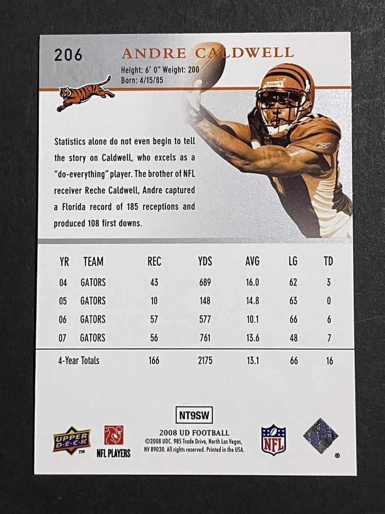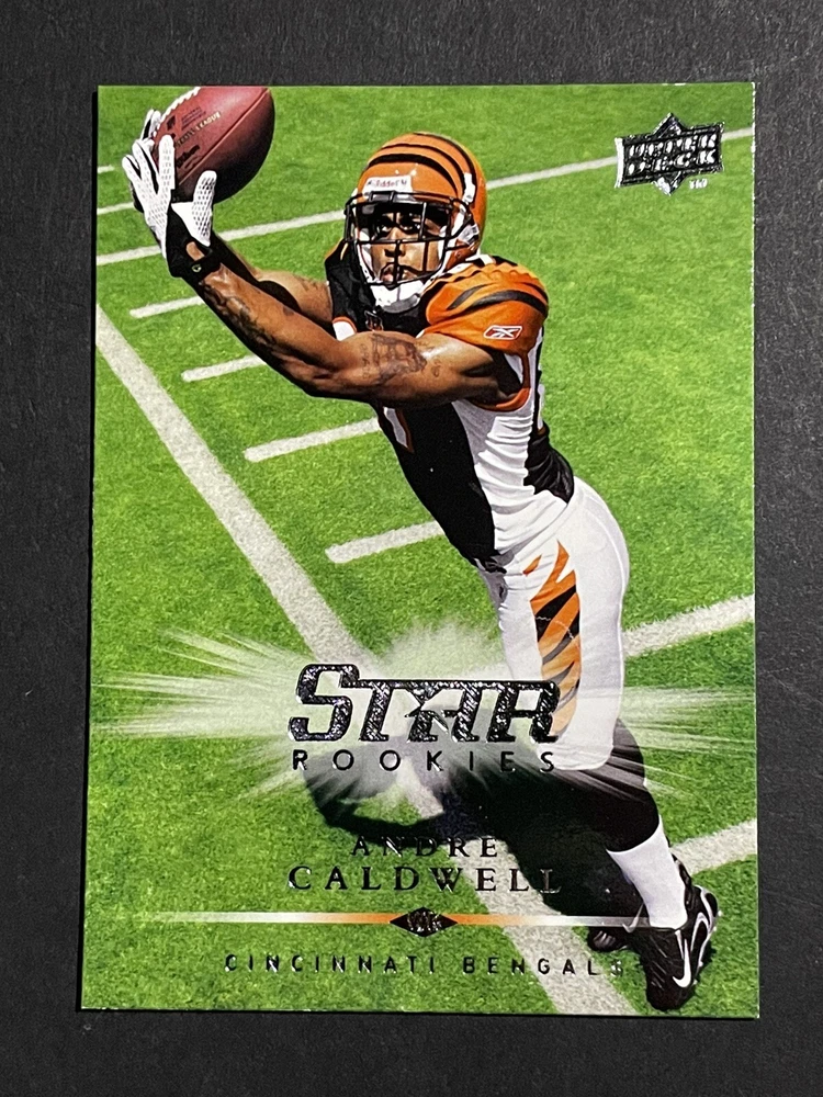 Manufacturer: Upper Deck Language: English Set: 2008 Upper Deck (Football) Player/Athlete: Andre Caldwell Type: Sports Trading Card Sport: Football Original/Licensed Reprint: Original Autographed: No Country/Region of Manufacture: United States Features: Rookie Material: Card Stock League: National Football League (NFL) Card Size: Standard Season: 2008 Team: Miami Dolphins, Buffalo Bills, New York Jets, Denver Broncos, New England Patriots, Kansas City Chiefs, Oakland Raiders, San Diego Chargers, Indianapolis Colts, Jacksonville Jaguars, Cincinnati Bengals, Pittsburgh Steelers, Cleveland Browns, Dallas Cowboys, New York Giants, Philadelphia Eagles, Washington Commanders, Tampa Bay Buccaneers, Atlanta Falcons, Carolina Panthers, San Francisco 49ers, Seattle Seahawks, Arizona Cardinals, Los Angeles Rams, Green Bay Packers, Detroit Lions, Minnesota Vikings, Chicago Bears