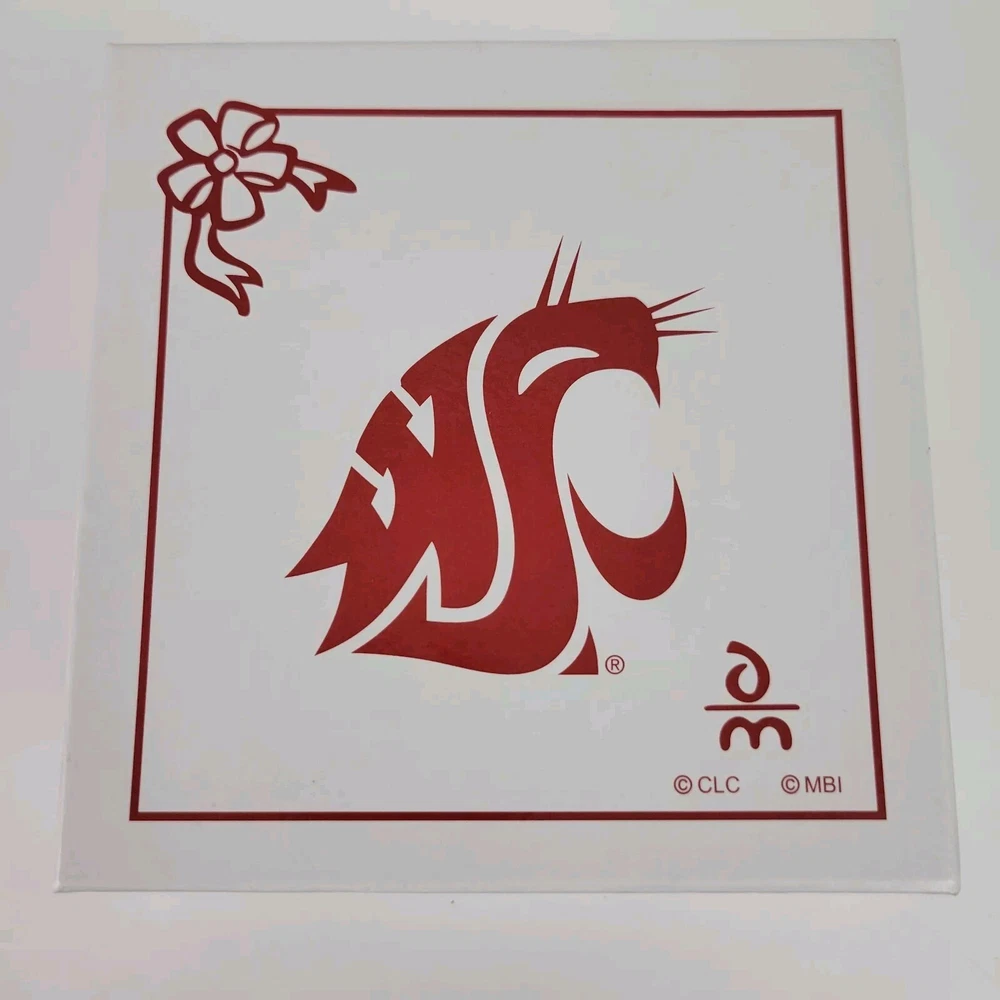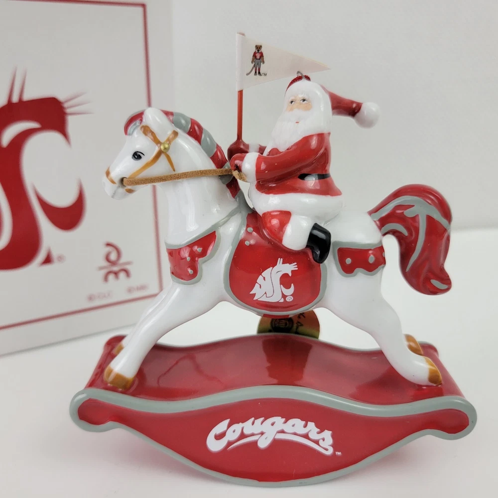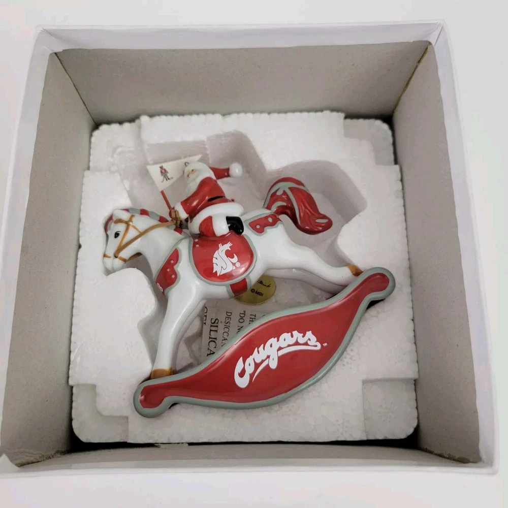 This is an excellent condition Ornament from the Danbury Mint. It features a "Rockin Santa" on a rocking horse, flying the Washington State University Cougars flag. It measures 4.25" x 4.5". It comes with the original box and bottom foam insert, but the top foam insert is missing. It will be packed carefully with replacement foam.