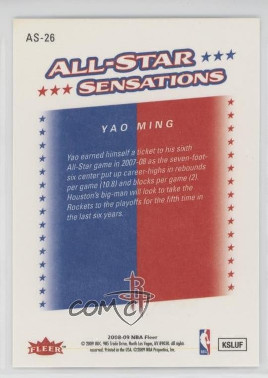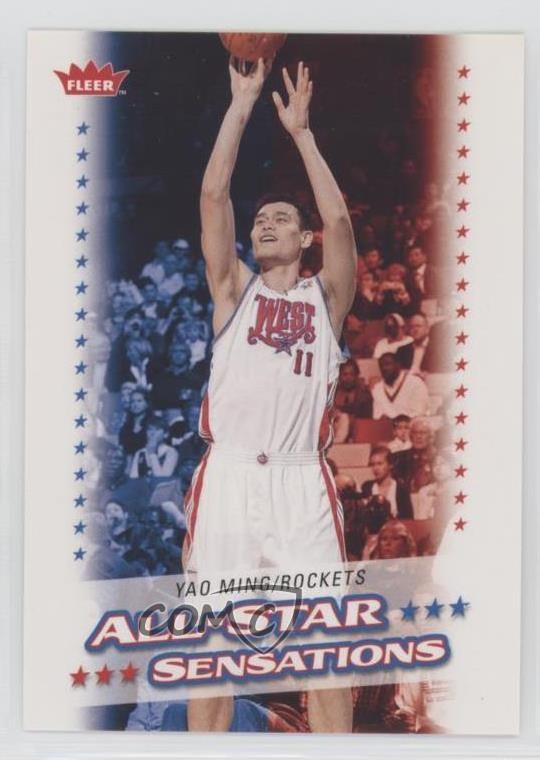 2008-09 Fleer - All-Star Sensations #AS-26 Yao Ming - Basketball Card - Featuring the Houston Rockets and NBA All-Star Team - Featuring Yao Ming Search for more: 2008-09 Fleer Search for more: 2008-09 Fleer - All-Star Sensations View all of our Listings Auctions Buy It Now About Us Located in the beautiful Pacific Northwest, COMC (Check Out My Cards) is the world's largest consignment service for trading card singles. More than 10,000 people have used our consignment service to list over 50 million trading cards. Find out how we can help you consign your items on eBay by contacting us through eBay messaging. COMC -- "The Safe & Easy Way to Buy & Sell" Representative Image - Select Specific Item above to see image of actual item Representative Image - Select Specific Item above to see image of actual item Raw Condition for Modern Cards Unless otherwise noted, raw modern cards are listed in Near Mint-Mint condition or better. A NM-MT card appears to be Mint at first glance, but upon closer inspection, may exhibit some of the following: minor print defects (e.g. roller marks, print line, dimple), minor scratches, slight edge wear, and slight corner wear. Centering is clearly visible in the images provided and does not factor into our condition assessment. Raw Condition for Vintage Cards Unless otherwise noted, raw vintage cards are listed in Excellent condition or better. An EX card may exhibit some of the following: minor rounding of corners, surface wear, print defects, light scratches, and slight edge wear/chipping. Centering is clearly visible in the images provided and does not factor into our condition assessment. Domestic Shipping Combined shipping for multiple items is available. To receive combined shipping, please ensure all desired items are in your eBay shopping cart before proceeding to checkout. eBay limits orders to 40 items per order. We automatically combine multiple orders placed on the same day. If you place multiple orders on the same day, please contact us to request a refund of applicable shipping costs. Signature confirmation may be required on invoices over $400. All cards are protected and shipped securely. International Shipping COMC offers eBay's International Shipping (EIS) for international orders under $2,500* (see country exceptions below). All duties and import fees are paid at checkout; in the rare event that there are additional import fees upon delivery, these are borne by the buyer. EIS packages route through a shipping hub in Erlanger, KY before shipping to their final destination. Please note that EIS does not allow for combined shipments. The shipping rates are determined by eBay and cannot be adjusted. *Maximum sale price exceptions: Colombia, Kuwait ($2,000); Taiwan ($1,539); Chile, Costa Rica, Guatemala, Honduras, Trinidad and Tobago ($1,000); Antigua and Barbuda, Aruba, Belize, Dominica, Grenada, Philippines, Saint Kitts and Nevis, Saint Lucia, Montserrat, Turks and Caicos Islands ($500); Dominican Republic, El Salvador ($200). Please request a shipping quote through eBay messaging for orders that exceed the maximum sale price supported by eBay's International Shipping. You will be responsible for all duties and import fees for international orders shipped outside the EIS. All cards are protected and shipped securely. Payment COMC does not accept offers on our cards through our eBay storefront. COMC utilizes eBay’s managed payments system. If you are experiencing difficulties making a payment, please contact eBay for assistance. Return Policy Returns are only accepted on the rare occasion the item is not as described. If you are making a return, please initiate the return process through eBay so a mailing label can be provided for you. Prior to listing, our expert team carefully assessed this item to represent it accurately. Please review the description and high-definition images prior to purchasing to ensure this item meets your satisfaction. We welcome you to contact us if you have further questions about this item. Trust and Integrity COMC carefully assesses each item consigned to us to prevent fraudulent items from entering the marketplace. If you believe an item offered on COMC may be fraudulent, please contact us with details so we can investigate the issue. Items we determine are outside our supported items policy may be removed. Last Modified: 6/4/2025 1:06:55 PM PDT