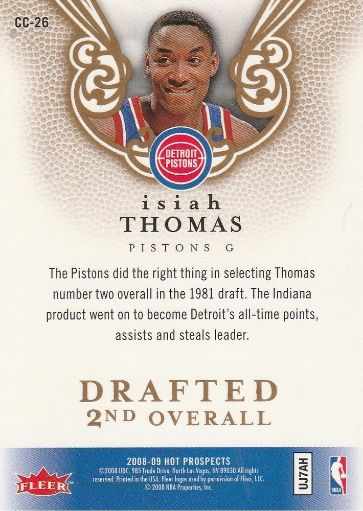 Team:Detroit PistonsSport:BasketballLeague:National Basketball Association (NBA)Card Number:CC 26Player/Athlete:Isiah ThomasSet:2008-09 Hot Prospects Cream of the CropType:Sports Trading CardFeatures:Single-InsertManufacturer:Fleer