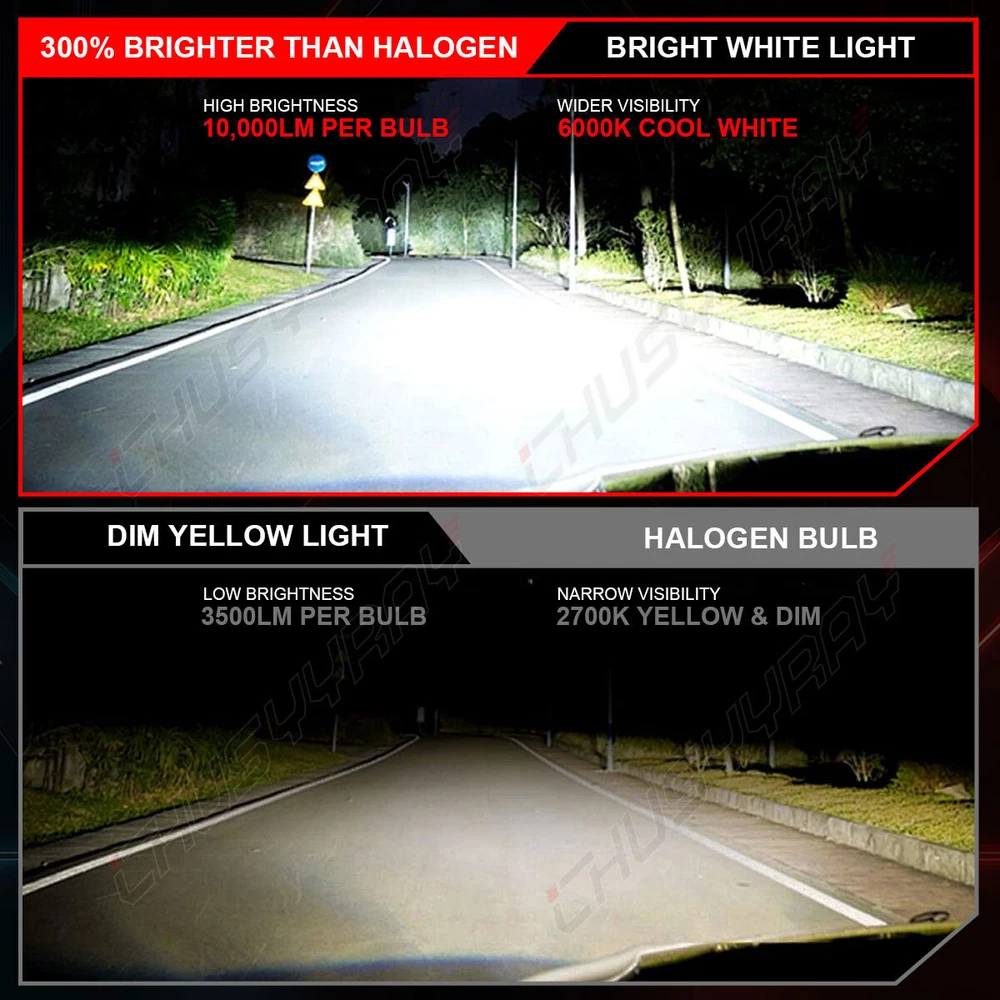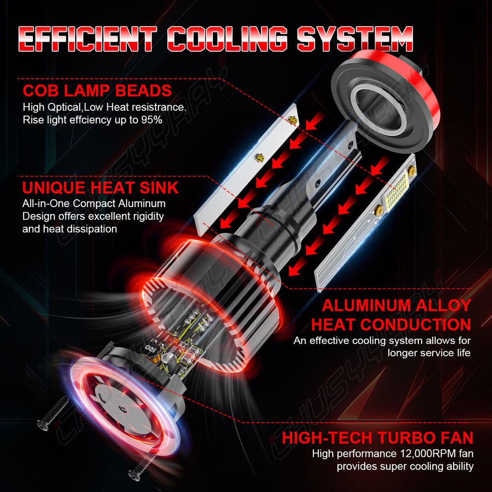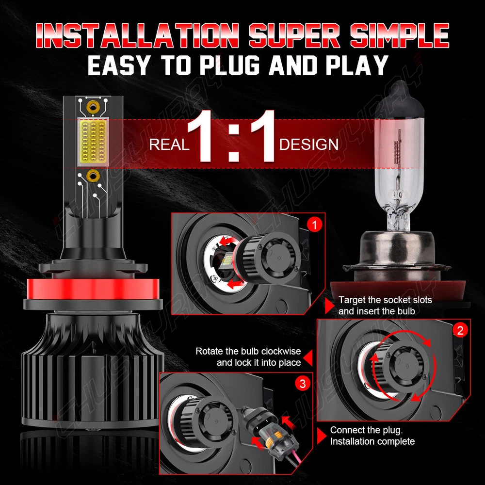 LED Headlight Kit All-in-One Conversion Kit 300% Brighter than Halogen: 100W 6000K cool white, 1w=100lm, with clear visibility and perfect beam pattern, so you can enjoy good vision while driving at night. Super Focused Beam Pattern: led bulbs with 1.0mm ultra-thin centered light emitting. No dark spots or foggy light, do not blind oncoming traffic. 10mins Easy Installation: The LED bulb’s almost 1:1 design as halogen. Plug and play. No other tools are needed 360° Adjustable Beam Pattern: Adopts 360° adjustable locker ring to ensure the best beam pattern. 50,000 hours Lifespan: Led Bulb comes with a copper base board, cold pressed aluminum heat sink and 12,000rmp cooling fan. Better solve the dimming or over heated of led bulbs. Energy-saving: Brighter light output with much less power consumption. Package Included: 4 pcs H9+H11 LED Bulbs . Note:Our LED replaces halogen bulbs ONLY. It does not replace HID or LED from factory. Item Specifics Technology: LED Fitment Type: Direct Replacement Voltage: DC 9-30V Power: 100W/per pair Luminous Flux: 10000LM/per pair Color Temperature: 6500K LED Chips: COB LED chips LED Drivers: Built-in Drivers Lifespan: Over 50,000 hours Waterproof Rate: IP67 Water and Dust Seal, CE, RoHS Operating Temperature: -40℃~+80℃ Warranty: 5 years warranty Application: Headlight High Beam & Low Beam & Foglight DRL Warm Tips: If you are not sure about the bulb size, please send us your vehicles' make/model/year via ebay message to confirm with us before purchasing. Any questions please feel free to contact us, we will help you solve it. Information: a)Compatible List can not show up all Car model. Please check the Correct item size of your vechicle. it will work and fit.Thank you! b)If you are unsure the item fit or not , please do remember send message to tell us your car make, model, year and other information which is helpful to check the item fit or not.For example: For 2004 Ford F 150, high/low beam For 2015 RAM 1500 with projector-type, high beam For 2019 Ford F 150 ,XL Crew Cab Pickup 4-Door 2.7L On Nov 19, 2024 at 02:18:40 PST, seller added the following information: