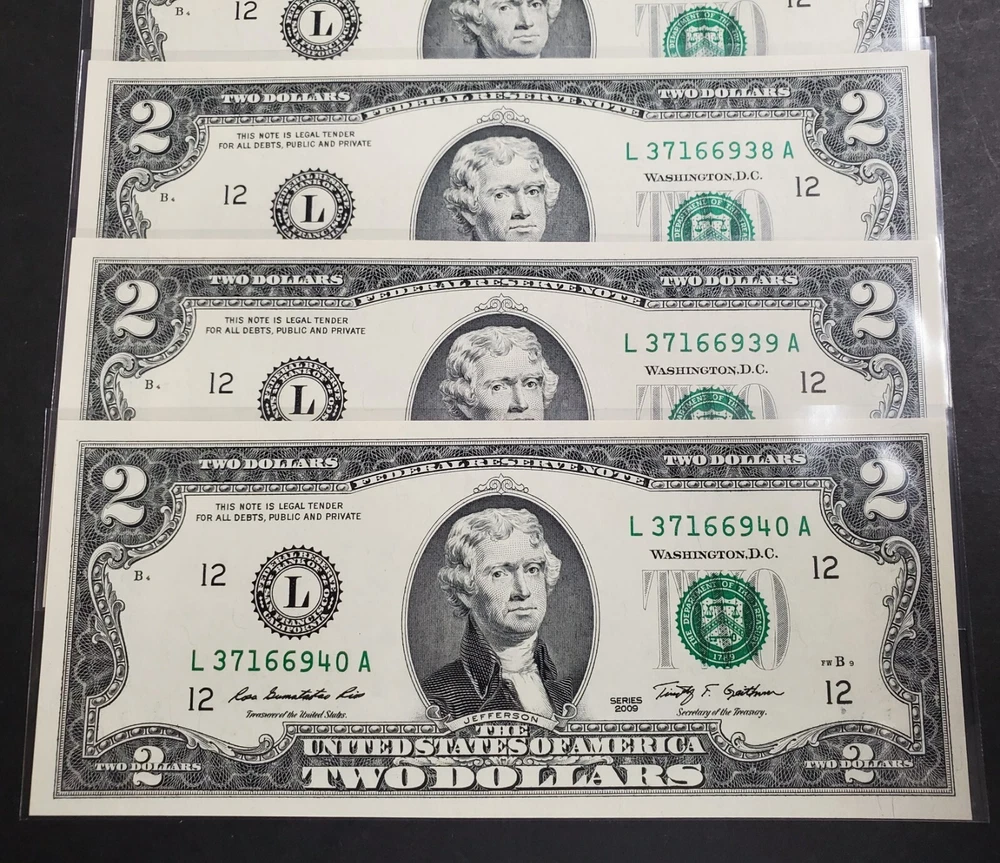 Nice Find: Sequential Lot of 5 - 2009 $2 Federal Reserve Notes (LA Block) San Francisco District. All Crisp GEM UNC Notes. Excellent Paper Quality. Each Note Comes shipped in a Guardhouse Top Loader Currency Holder. *** INTERNATIONAL SHIPPING QUOTED*** Thank you for viewing... Please email any questions you may have.... Take a moment and check out our other unique auctions !!! ***** Email us about signing up for our mailing list******* Exciting new items every day Philately - The Quiet Excitement Shipping We try to Ship Within 5 Business Days of Cleared Payment Will calculate international shipping PLEASE READ International Buyer's Shipping Instructions International shipping "" First Class Registered ENVELOPE " NO EXCEPTIONS ! ** Insurance, Registered mail or Confirmation/Signature Guarantee is included in the price of shipping for the USA only ** Our goal is to please our customers, provide quality and unique items, have successful transactions and earn positive feedback with a 5 star rating. We strive for accurate descriptions, quick turnaround, detailed communication, and reasonable shipping charges on every lot. Your feedback is important to us. If you feel anything about the transaction was less than 5 star, please give us the opportunity to rectify the situation Thank you The Staff at Henry Gitner Philatelists, Inc.