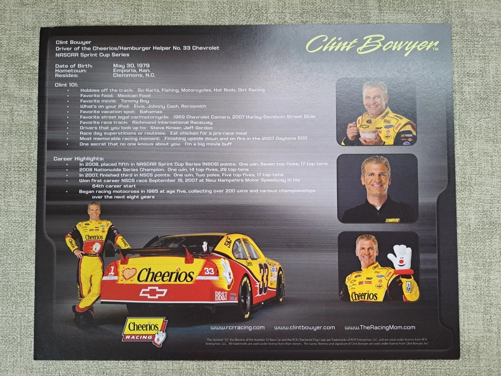 2009 CLINT BOWYER autographed NASCAR 8×10 Photo Card Cheerios Chevrolet. I'm the original owner of this piece and witnessed Clint sign this card in front of me. I worked for General Mills at the time Clint Bowyer was at the headquarters in Minneapolis for a promotional appearance. FYI...there is a slight crease in the upper right edge of the card. See pictures for the overall condition of the item. Let me know of any questions or if you need additional pictures. Thanks for your interest.