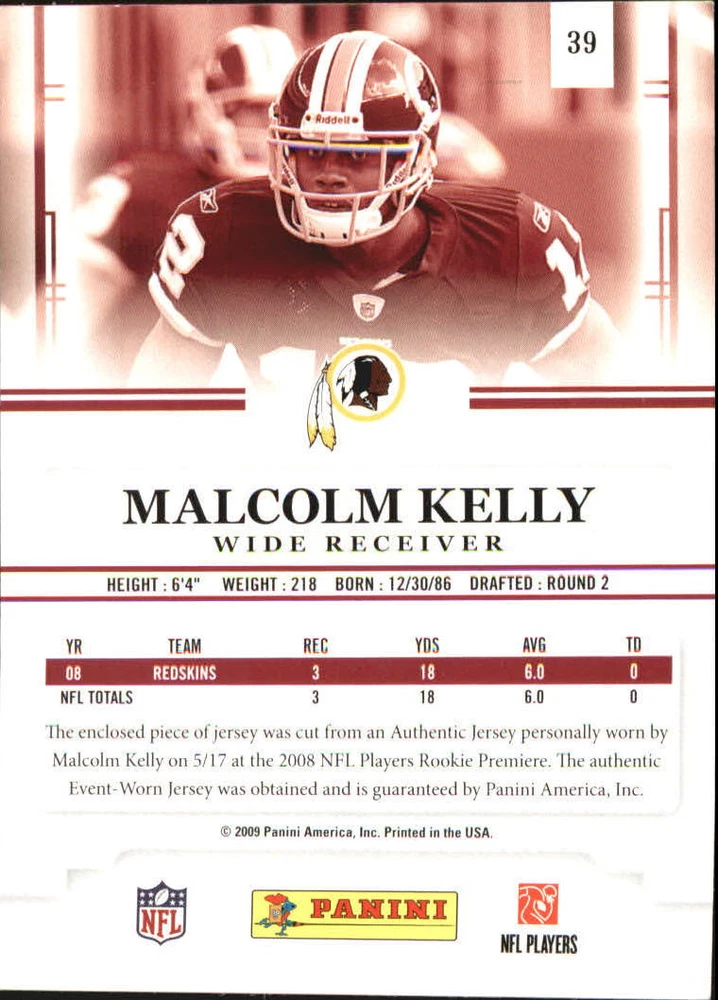 Item Condition: Near Mint/Mint Original/Reprint: Original Sport: Football Grade: Near Mint/Mint Graded: No Team: Washington Redskins Item Attributes: Memorabilia Brand: Playoff Prestige Player: Malcolm Kelly Product: Single Period: Modern (1970-Now) Year: 2009 Card Manufacturer: Donruss/Playoff