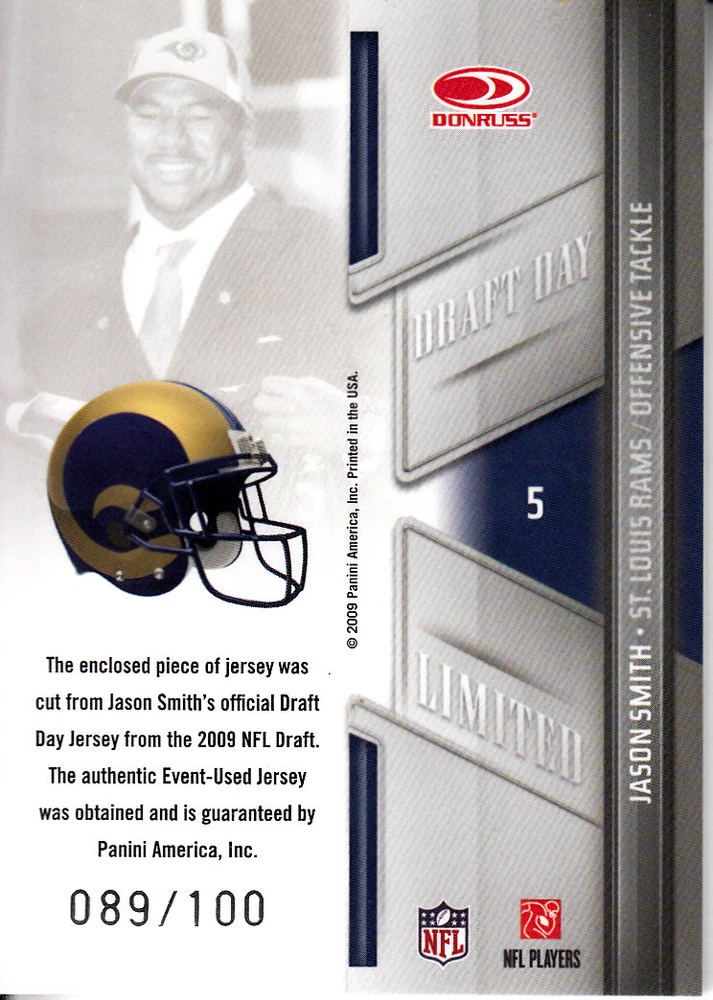 2009 (RAMS) Limited Draft Day Jerseys Prime #5 Jason Smith/100 Jsy Front Back Sport: Football Set: 2009 Limited Draft Day Jerseys Prime Year: 2009 Item#: 5 Player: Jason Smith Team: St. Louis Rams Attributes: Memorabilia, Serial Numbered Brand: Limited Manufacturer: Panini Group Grading Company: Raw Grade SetType: Parallel Insert Item Condition: Near Mint/Mint 2014 Beckett Collectibles, LLC. All Rights Reserved Powered by: Thank you for choosing Burbank Sportscards, the sports cards superstore. We offer a large selection of singles across all sports. Visit our ebay store to view all our items available. Our Shipping Policy We offer Free Standard Shipping to all Domestic customers. Options for Expedited shipping are also available at checkout. For our international customers, shipping is $9.99 for the first item, and $0.25 for each additional item. Note to all customers: To qualify for combines shipping, we ask our customers to add items into the shopping cart. Please note, we do not combine orders that are placed separately. Our Service: Generally, our turnaround is super quick as we process and send out orders same day payment is received. Stock Availability: We do our best to ensure all items are in stock; however, in case of the rare stock out, the customer will have the option for a replacement card, or we will process a refund so the order is not held up. Our Images: Many of our images are stock photos from Beckett archives. They are a representation of the actual card you would receive. If you have any questions regarding the item you're interested in, please feel free to ask (serial numbers and relic pieces may vary) Moreover, in a case of a wrong or defective photo, please notify us, so we can adjust it. Other FAQ's: -When buying multiple cards, do you top load each item? No; however, we do try to insure all items are shipped securely. If you wish to have all of your cards top loaded it is a paid service and can be arranged. Please email for more details. For other questions, please feel free to ask. Thank you.