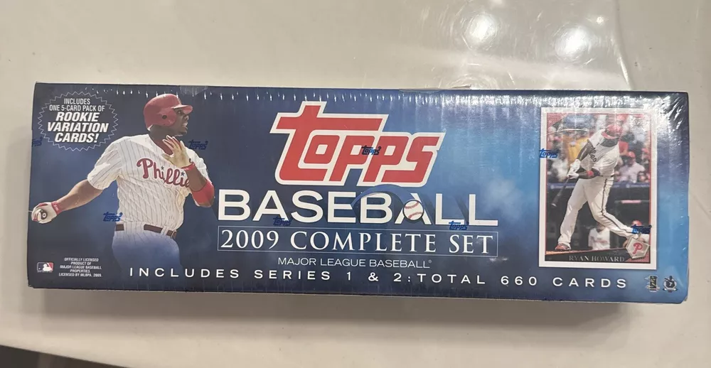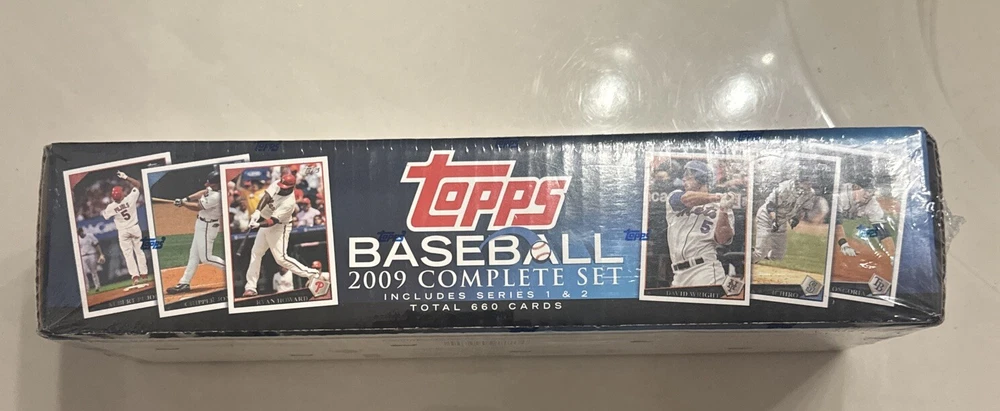 The product is a 2009 Topps Baseball Card Complete Set Hobby Edition, factory sealed in a box. It contains 660 cards featuring players from Major League Baseball teams like the Boston Red Sox, Yankees, and Chicago Cubs. This set is manufactured by Topps and is from the 2009 season. It is a sports trading card set focused on baseball.