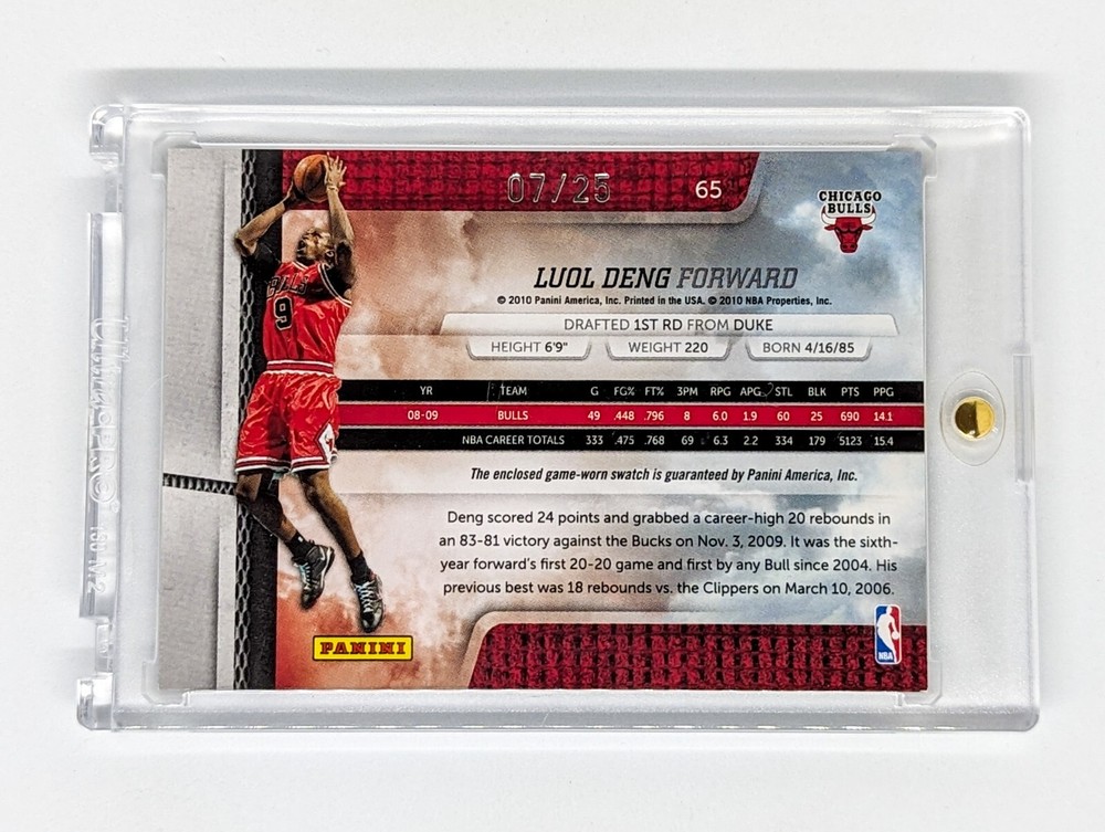 Autographed: No League: National Basketball Association (NBA) Parallel/Variety: Prime Sport: Basketball Set: 2009-10 Absolute Memorabilia Manufacturer: Panini Player/Athlete: Luol Deng Card Number: 65 Type: Sports Trading Card Card Name: Spectrum Materials Season: 2009-10 Features: Insert, Memorabilia, Parallel/Variety, Serial Numbered, Short Print Team: Chicago Bulls