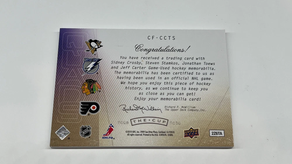 2009-10 Upper Deck The Cup Quad Patches - Sidney Crosby (2 color), Steven Stamkos (4 color), Jonathan Toews (2 color), Jeff Carter (3 color). Beautiful card in great condition. Shipped with USPS first class and will be well protected. Please let me know if you have any questions