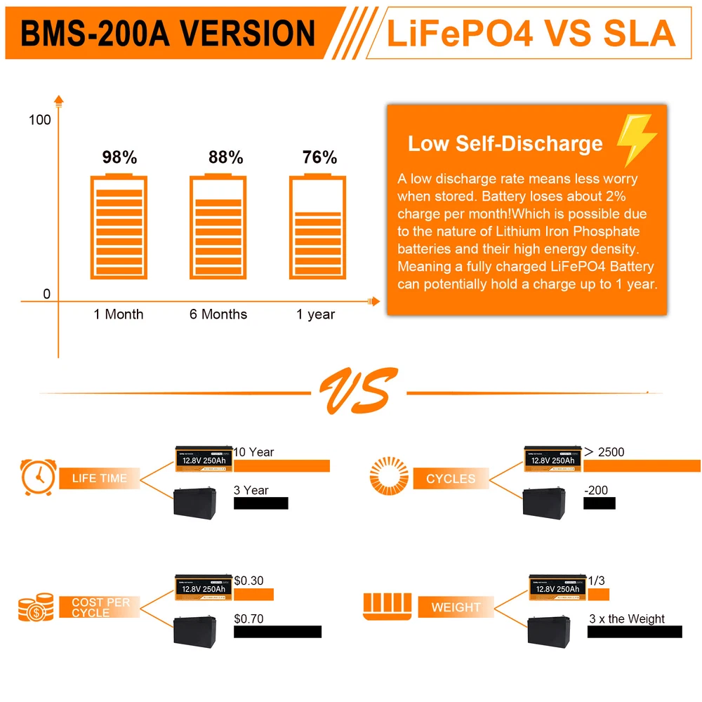 200A BMS Lithium Battery 12V 250Ah LiFePO4 3200Wh Bluetooth App for Solar Camper