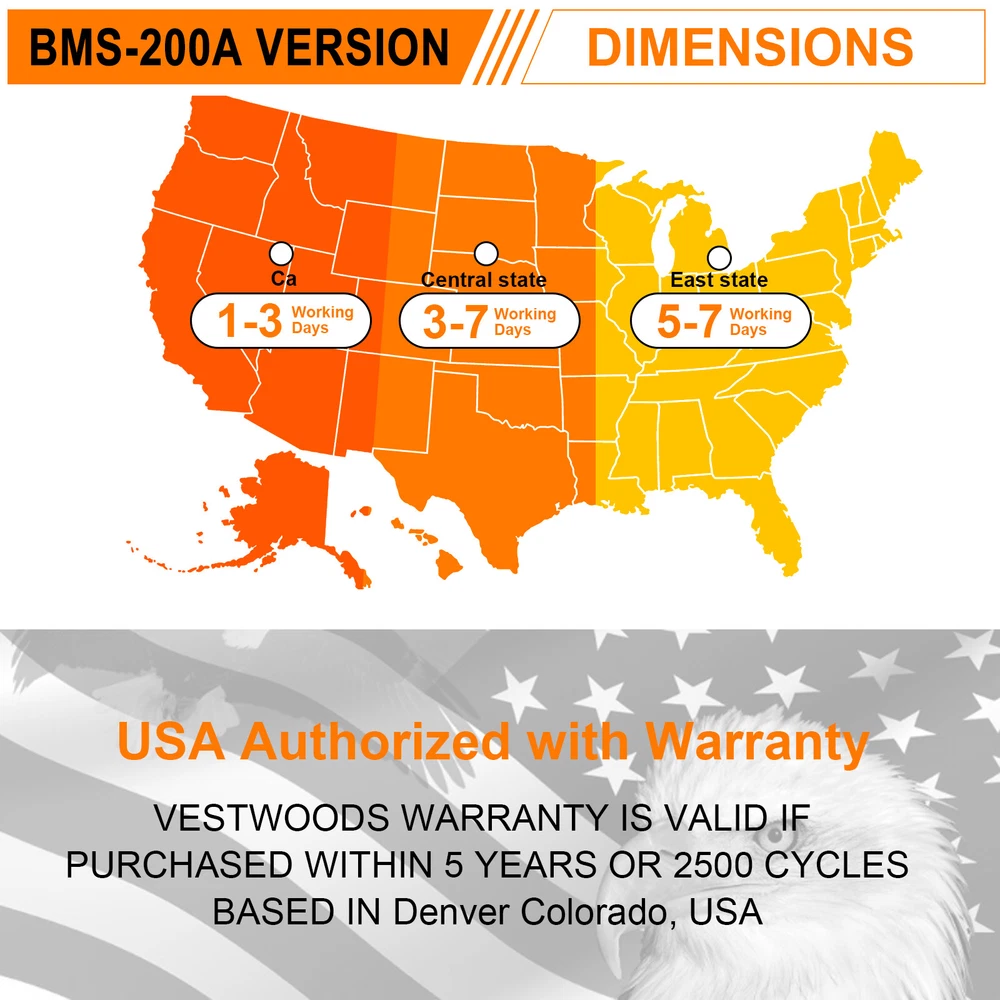 Description: [Real-time Monitoring] VESTWOODS lithium iron battery improves real-time monitoring function and obtains various data (SOC) of the lithium iron phosphate battery. Support connecting the battery through the mobile phone APP, and showing the battery voltage, current, capacity and the other information at any time. Service life increase more than 45% and failure reduced 50% with 4Pcs 3.2V 250Ah cells [Energy Storage & Save Money Solutions] VESTWOODS 12.8V 250AH batteries support up to 4 pcs in series and 8 pcs in parallel, you could get 12.8kWh and 25.6kWh. Max connected in 16 batteries (4S4P) to get 51.2kWh. Support simple connection compared with others mesh connection on 4S4P, will save $100 and half of wires usage [Intelligent Protection & Fast charge design] VESTWOODS 12.8V 240Ah LiFePO4 battery has self-developed 200A BMS, Max load power up to 25kW, prevent damage to your battery. Built-in low-temp cut off prevents overcharging, only Interior cell is 32F/0C will be charged cut off by own. Support 1280w fast charge, 2 hours full charged [Friendly Energy & Effective Integrated] VESTWOODS 12.8V 250Ah LiFePO4 battery has provides max.4500+ cycles times and 3200Wh energy, which means our 100Ah battery produces 14400kWh (3200Wh*4500 cycles times=14400kWh) @100% DOD, as well as that you can save more than a half of electricity fees compared to using commercial power. 12V 250Ah LiFePO4 battery covered stainless steel bracket via laser welding and metal support column, make inside of the battery is kept orderly, reliable and sturdy [Delivery & Customer Service] The VESTWOODS LiFePO4 batteries will be shipped from our US Local warehouse in Los Angeles, CA. SHIPPING TIME: 3-7 WORKING DAYS. 12-24 hours online help solve problems. Your VESTWOODS warranty is valid if purchased within 5 years or 2500 cycles Specification: Nominal Capacity:250Ah Charging Voltage(DC): 14.4-14.6V Nominal Voltage: 12.8 V Cycle Life: 2500-4500 Cycles Maximum Continuous Charging Current:200A Maximum Charging Power: 2900W Charging Temperature: 32-140°F/ 0-60°C Maximum Continuous Discharging Current:200A Maximum Discharging Power:2560W Discharging Voltage(DC): 10.8-14.2V Discharging Temperature:-4-140°F/ -20-60°C Min.Wire Gauge: 2/0AWG Connection Method:Support up to 4S/8P/4S4P Dimensions: L20.9 * W10.9 * H8.9 inch Return Service YOUR VESTWOODS WARRANTY IS VALID IF PURCHASED WITHIN 5 YEARS OR 2500 CYCLES BASED IN Denver Colorado, USA If you are not happy with your purchase, we will accept a return of a unused product within 30 days. Once we receive the returned item Vestwoods will then give an refund. 1. 10% restocking fee will be charged for refund. 2. Shipping fees are non-refundable. 3. Return shipping label will be paid for by the buyer. 4. 30-day return policy only. Please allow 1-2 weeks for your return to be processed. Discounted items are not eligible for a return. Vestwoods will not issue refunds for products purchased through other entities, such as distributors or retail partners. Returned items must be delivered to us unused, in original packaging and in the condition they were received or may not be eligible for refund or be subject to a restocking fee. We cannot be held responsible for items damaged or lost in return shipment, therefore we recommend an insured and trackable mail service. We are unable to issue a refund without actual receipt of the item(s) or proof of received return delivery. We aim to accept all returns. In the unlikely event that an item is returned to us in an unsuitable condition, we may have to send it back to you. All goods will be inspected on return.