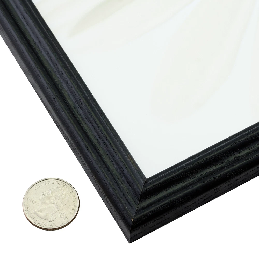 Traditional style; shiny black with wood grain finish Frame includes: glass, rigid black backing and pre-attached stamped hanging hardware Frame holds a 9 inch by 14 inch photo/print/poster (viewable area is slightly smaller) Frame moulding is 0.75 inches wide; real ash; solid wood Made in the U.S.A.