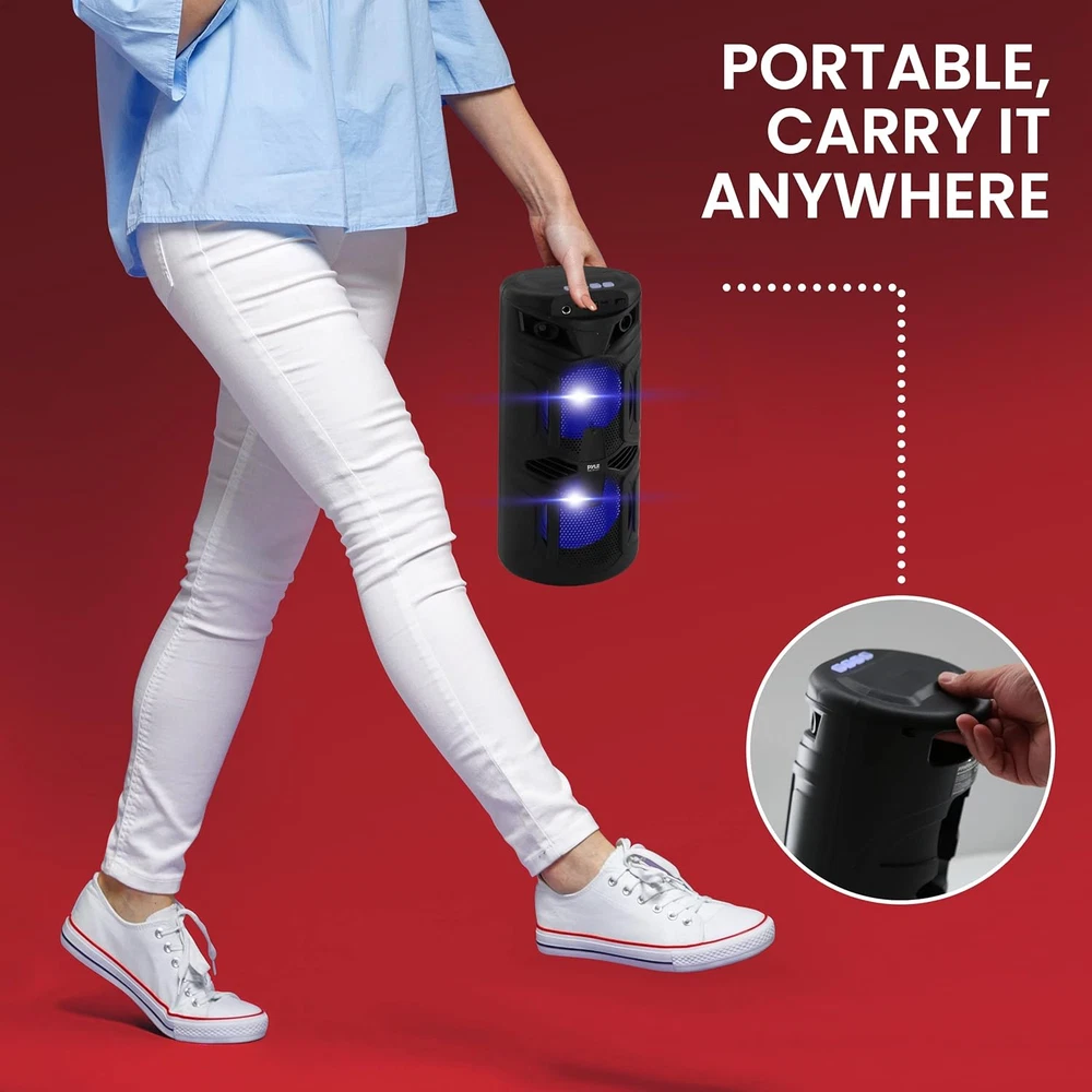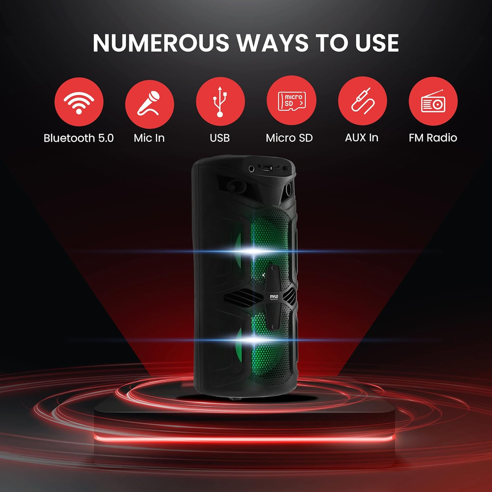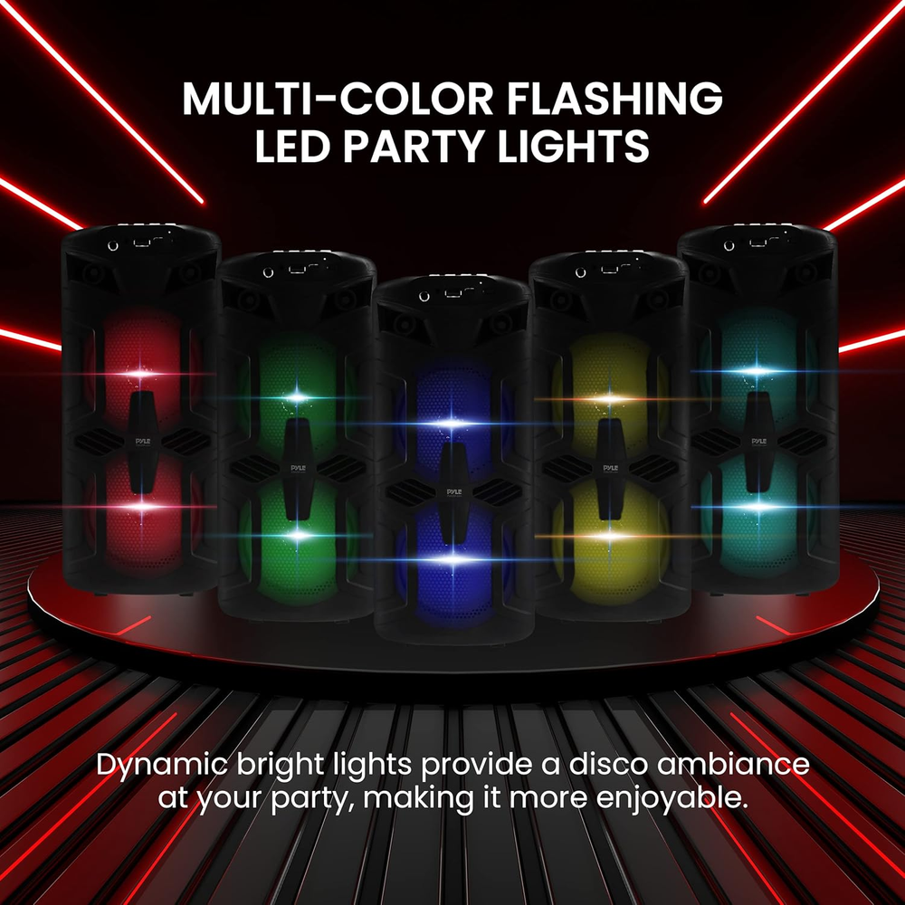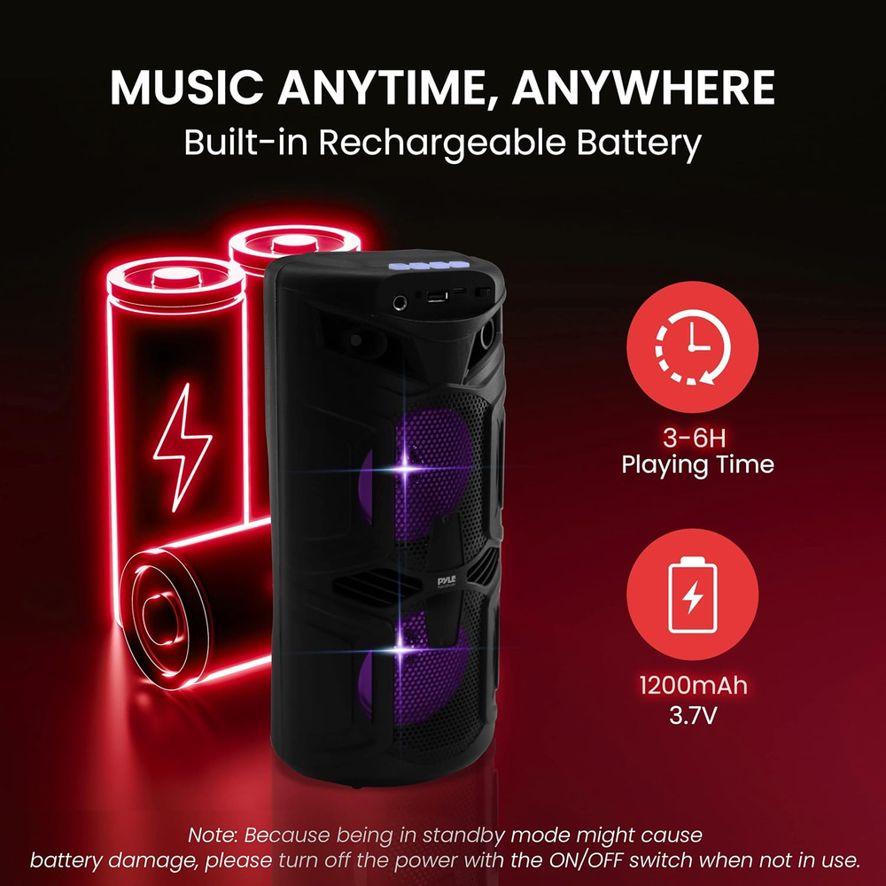 200 WATT POWER: This PA amplifier speaker system and mic set by Pyle features dual 4" subwoofer 1" tweeter w/ 200 watt peak power & TWS function for full-range surround stereo sound reproduction and impressive bass response RECHARGEABLE BATTERY: This battery powered speakers and heavy-duty wireless PA bluetooth speaker with microphone has a built-in 1200mAh, 3.7V Lithium rechargeable battery which makes it convenient and portable DIGITAL LED DISPLAY: Pyle bluetooth speaker karaoke PA system is equipped w/ FM radio w/ digital LED display, USB flash drive reader to serve as MP3 player, 3.5mm AUX in, & 6.5mm microphone input. Includes remote control & wireless mic BLUETOOTH AUDIO STREAMING: This party speaker features Bluetooth for wireless audio streaming devices like tablet, PC, android mobile & smartphones. Ideal for personal indoor and outdoor use, as well as dj speakers and voice amplifier FLASHING LED LIGHTS: Not only does this pa system sound great, but it also looks great lighting up in a variety of color combinations. Great for patio parties, or gatherings at night when a colorful presence is noticeable, ideal as a karaoke speaker Features: True Wireless Stereo System Portable Speaker System High-Powered PA Loudspeaker Style Wireless Music Streaming Ability Multi-Color Flashing LED Party Lights Built-in Rechargeable Battery FM Radio with Digital LED Display Connect & Stream Audio from External Devices Aux (3.5mm) Input Connector Jack USB Flash Memory Reader 6.5mm Microphone input Rugged & Durable Molded Cabinet Design Convenient Carry Handle For Indoor / Outdoor Use Bluetooth Wireless Streaming: Built-in Bluetooth for Wireless Music Streaming Simple & Hassle-Free Pairing Works with All of Today’s Latest Devices Smartphones, Tablets, Laptops, Computers, etc. Bluetooth Version: 5.0 Bluetooth Network Name: ‘PYLEUSA’ Wireless Range: Up to 32’ ft. What's in the Box: PA Speaker System Remote Control USB charging cable Wired Microphone Technical Specs: Material: Polypropylene (PP) Max Power Output: 200 Watt Max Sound System: 4'' woofer x2+1'' Tweeter Impedance: 3 Ohm USB Interface Type: 2.0 Digital Audio File Support: MP3 Maximum USB Flash Support: 32GB Remote Control Battery Operated, 1 Piece Button Cell Battery CR-2025 (Included) Battery Life: Up to 3 Hours (Charge Time: Approx. 4.5 Hours) Rechargeable Battery: 3.7V, 1200mAh – 8.88 Wh Power Supply: 120/240V, Switchable (5V/2A Power Adapter) Product Dimensions (L x W x H): 5.91'' x 5.91'' x 13.19'' -inches Sold as: 1 Weight: 11.2 lbs.